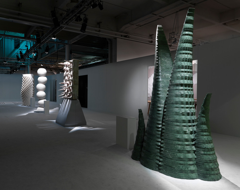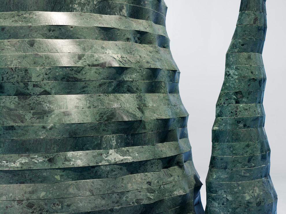 Agave, pictured, is a 3-metre-high hollow cylindrical sculpture made from a 80 x 30 x 2 centimetre block of marble. The material was initially cut into 10 slabs. Then, using five-axis water-jet technology, it was possible to cut the inner side of the marble block and obtain numerous rings, which were stacked into their final shape with the help of 3-D modelling software.
