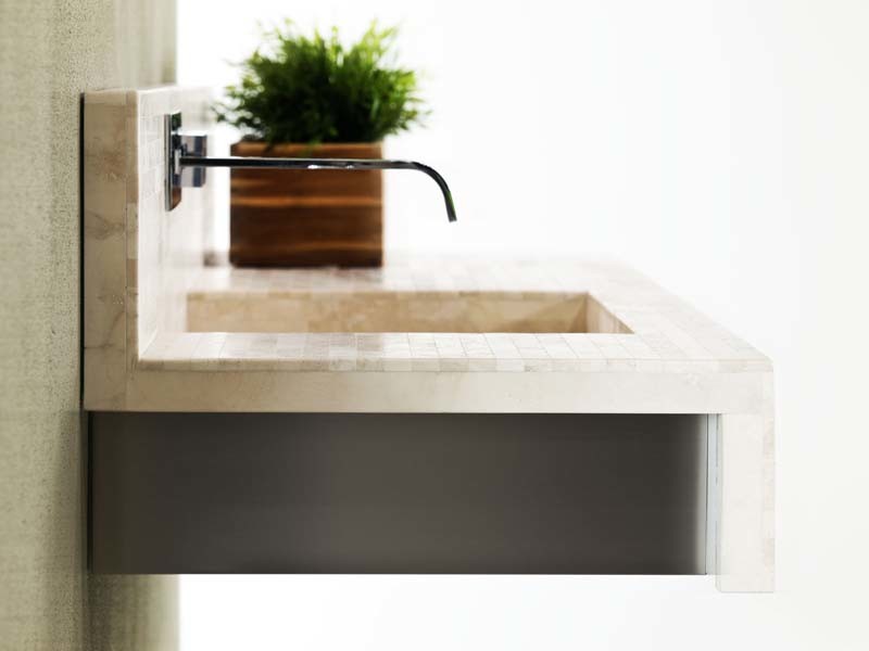 Ricciardi of Nice&Square says its patented system Stonewave meets this challenge. The product, pictured above, consists of a custom-shaped, super-light aluminium structure covered in hand-finished marble slats. It’s one-third lighter than solid marble and, thanks to the support, strong and resistant to bending. It’s possible to produce lengths of up to 4 metres without a joint. It’s also environmentally friendly: its marble comes from materials recovered from the processing of marmette (1 centimetre-thick tiles).
