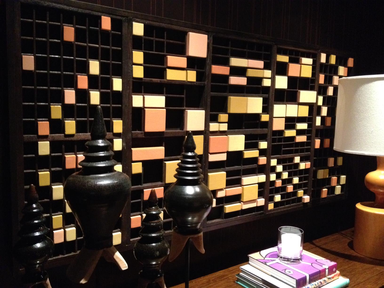 These large printer trays have been joined together to make one huge artwork with massive impact. Printer trays full of bits and pieces, or in this case simply coloured boxes, can be a great alternative to a print or painting to decorate your walls.