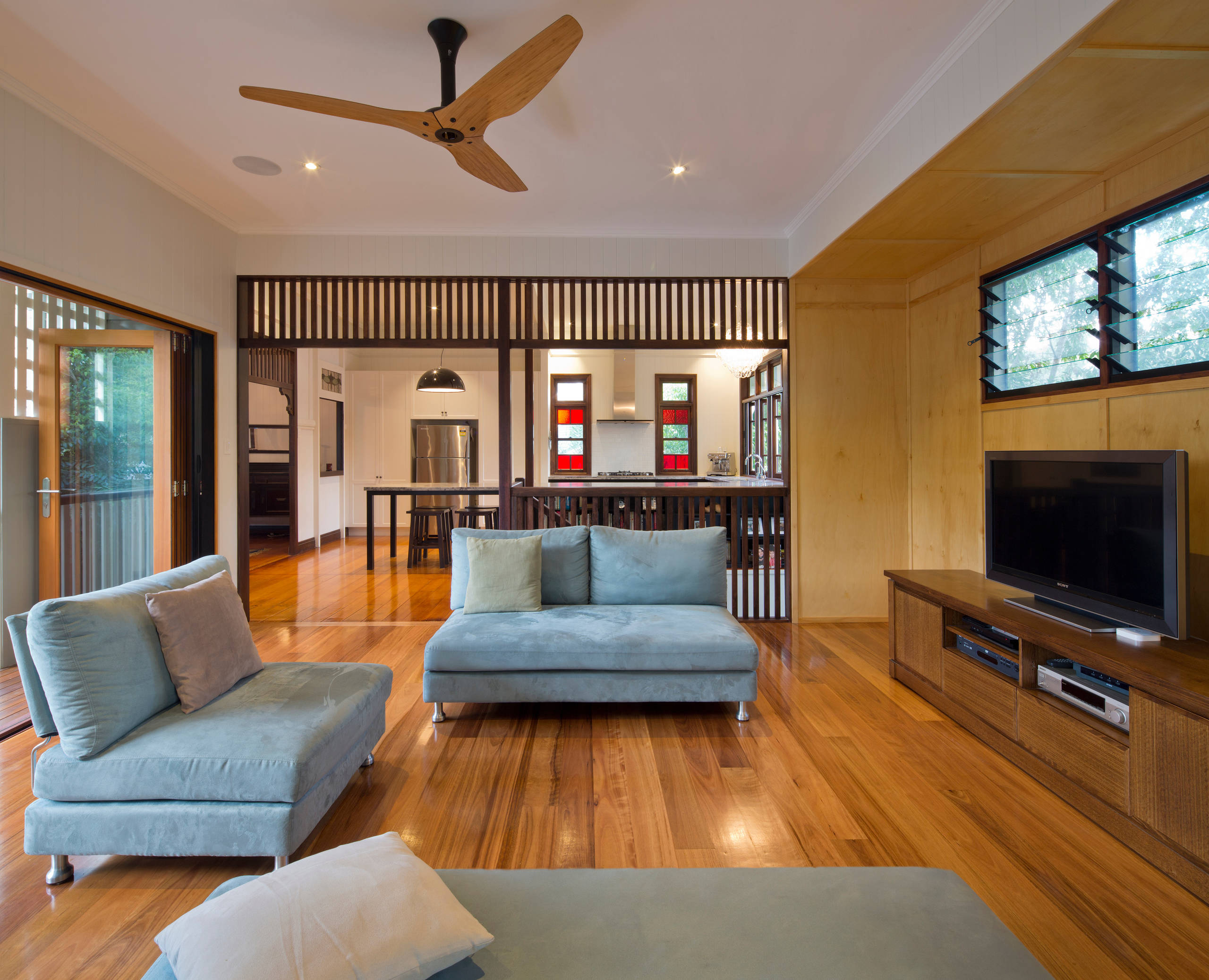 The techniques employed for natural cooling vary across Australia from the tropical climates up north to the more temperate environments in the southern regions. Depicted here is a prefect example of how a home can take advantage of the air outside – the rectilinear living space is proportioned to capture the breezes across the short breadth, from the large opening of the bi-fold doors to the high louvered windows opposite. Cooling is improved by the installation of a Haiku bamboo ceiling fan to gently circulate the air.