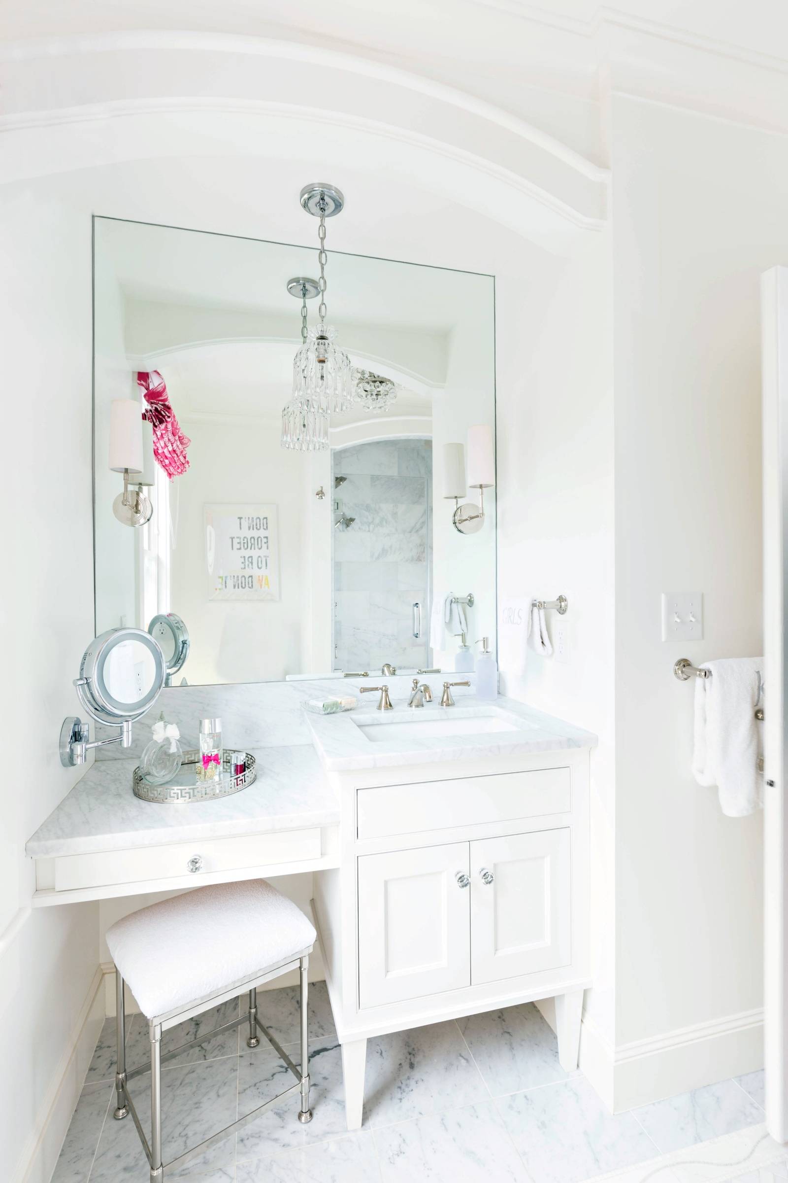 If you don’t have much room to spare, don’t fear. It’s still possible to set up a little make-up corner. It’s not so much about having lots of space, but rather using what you have to create a relaxed spot. A stool that fits under the desk saves on space, and a magnifying mirror that sticks on the wall will too.