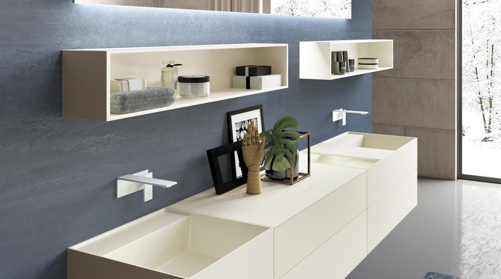 Angular gooseneck mixer taps can look very industrial, but choosing them in a white colour softens the look.