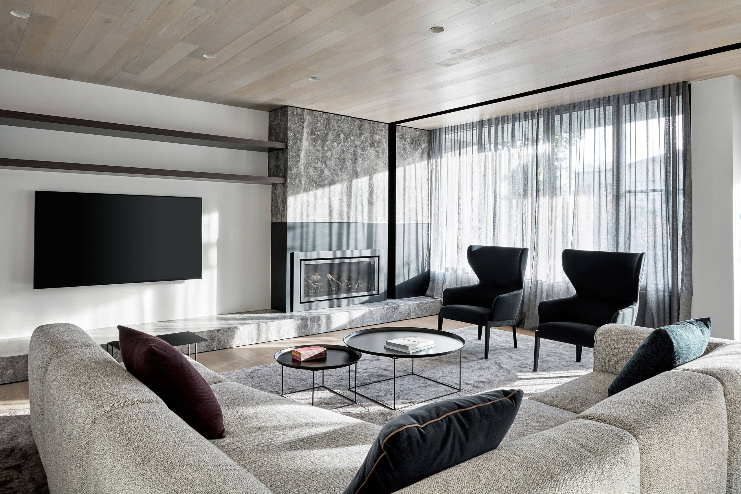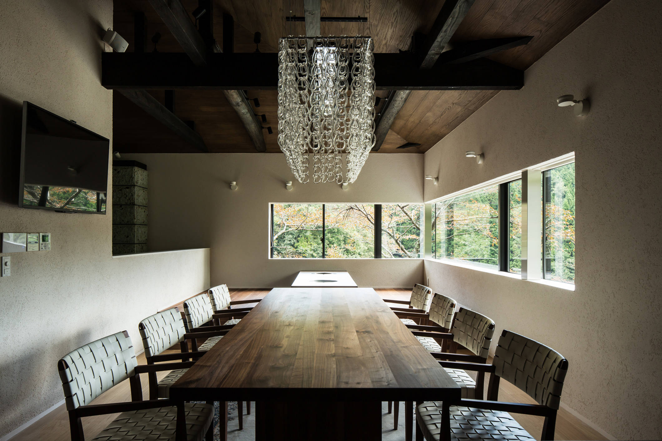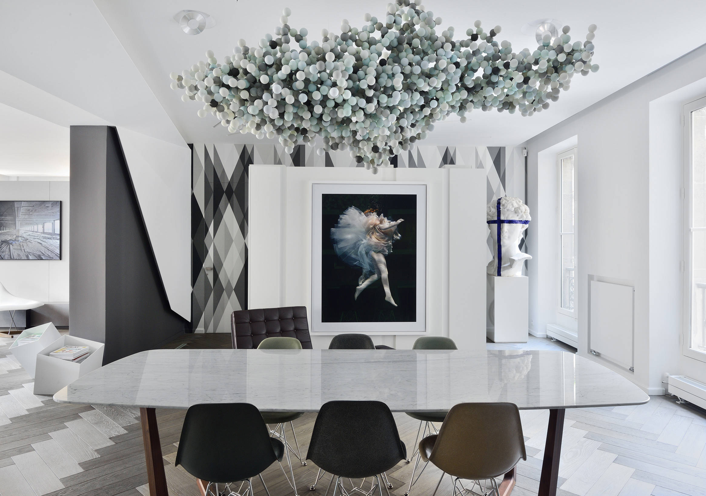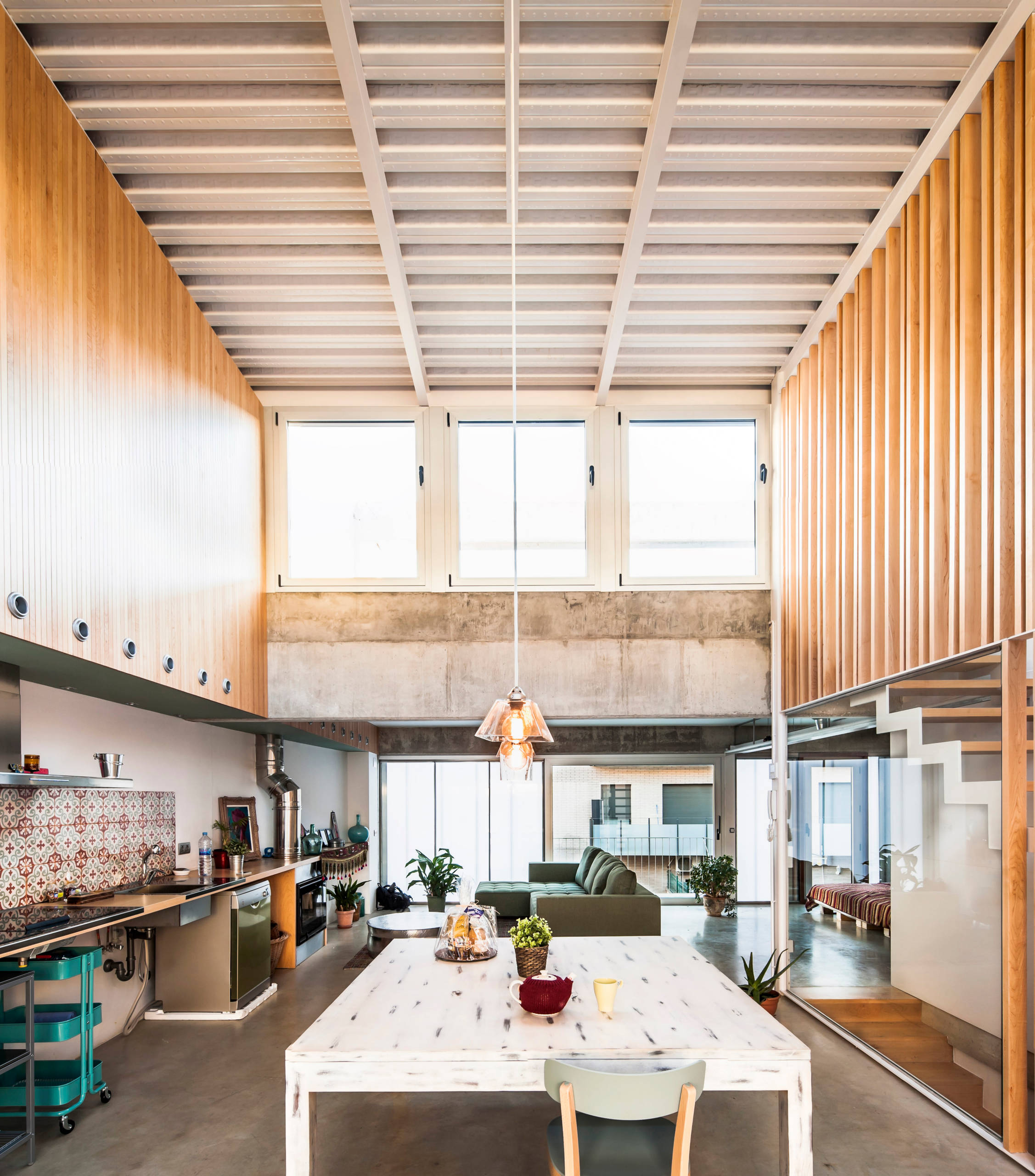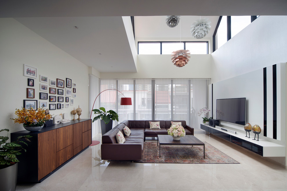 Features: Enough height to have a void plus three Louis Poulsen pendants.