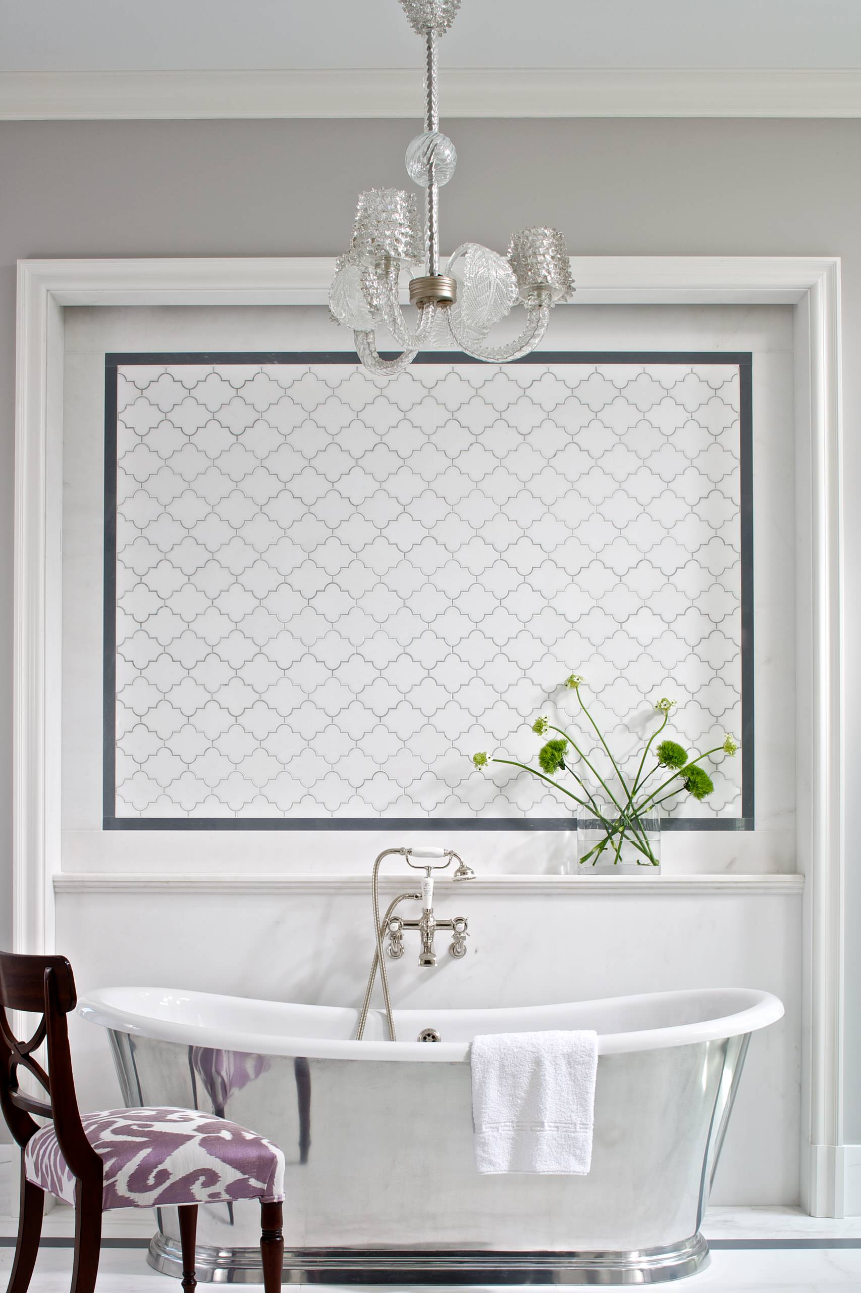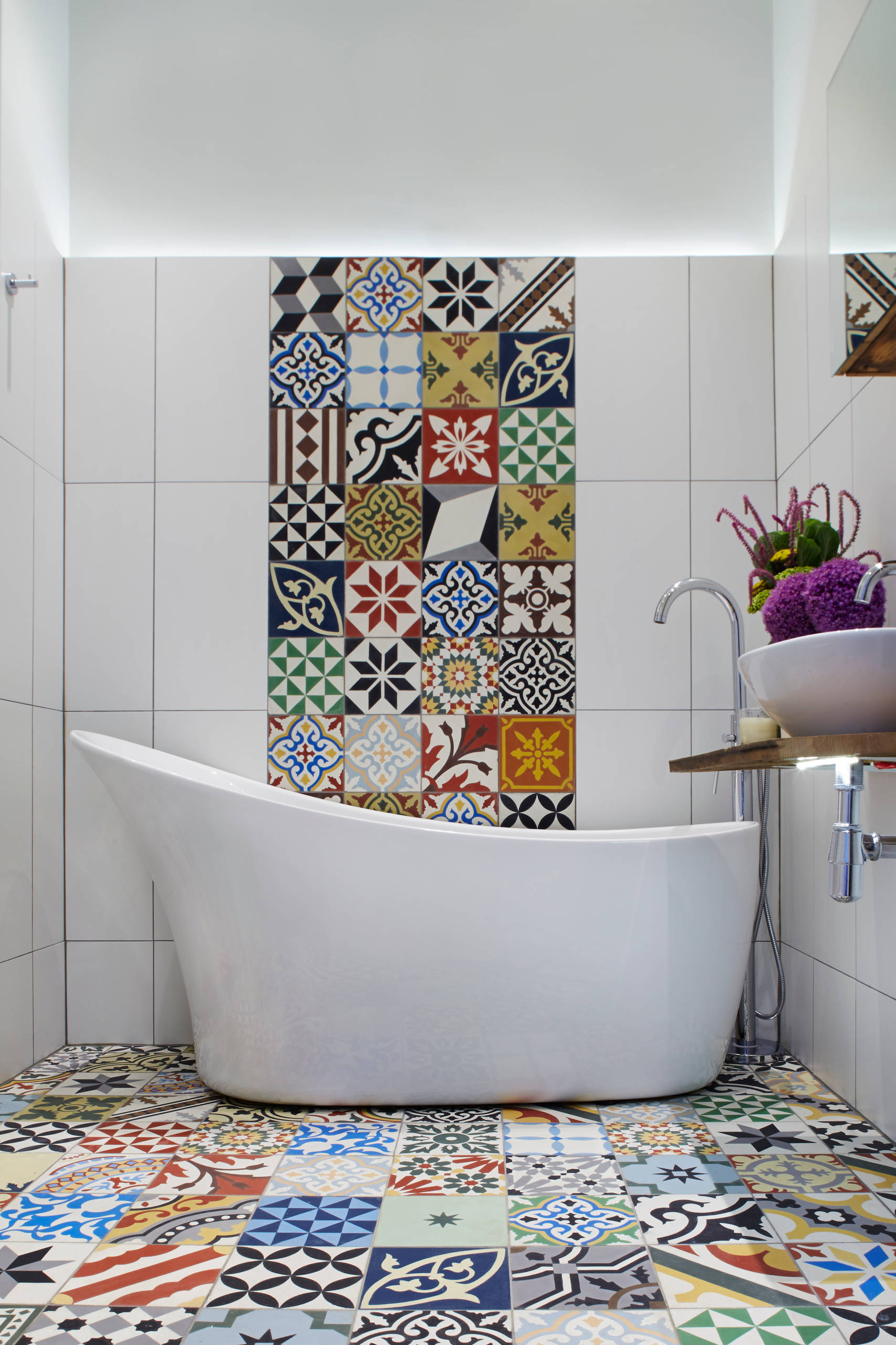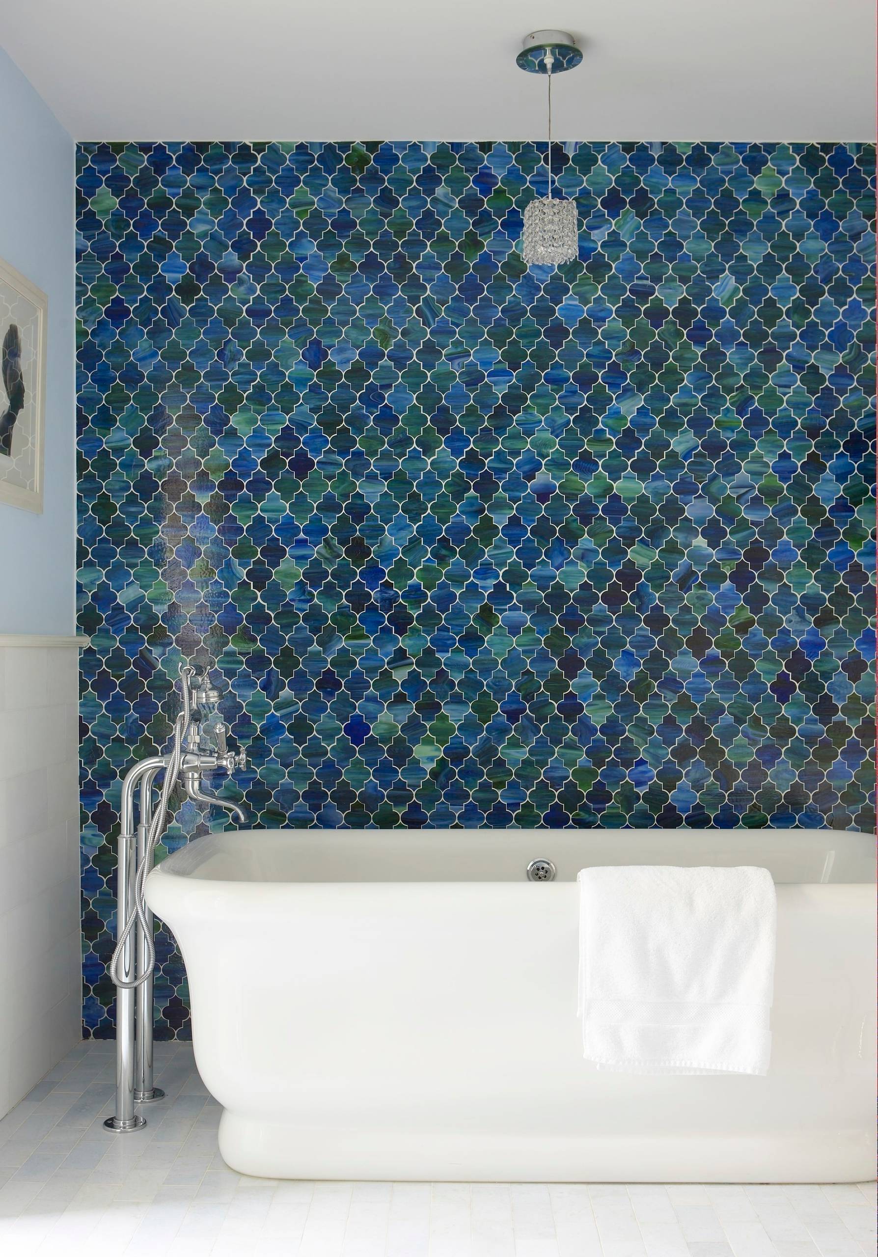 Or completely tile one wall, leaving the other walls and the floor white. Here a feature wall in oceanic tiles makes a statement, but simplicity is present in the sleek lines of the stand-alone tub.
