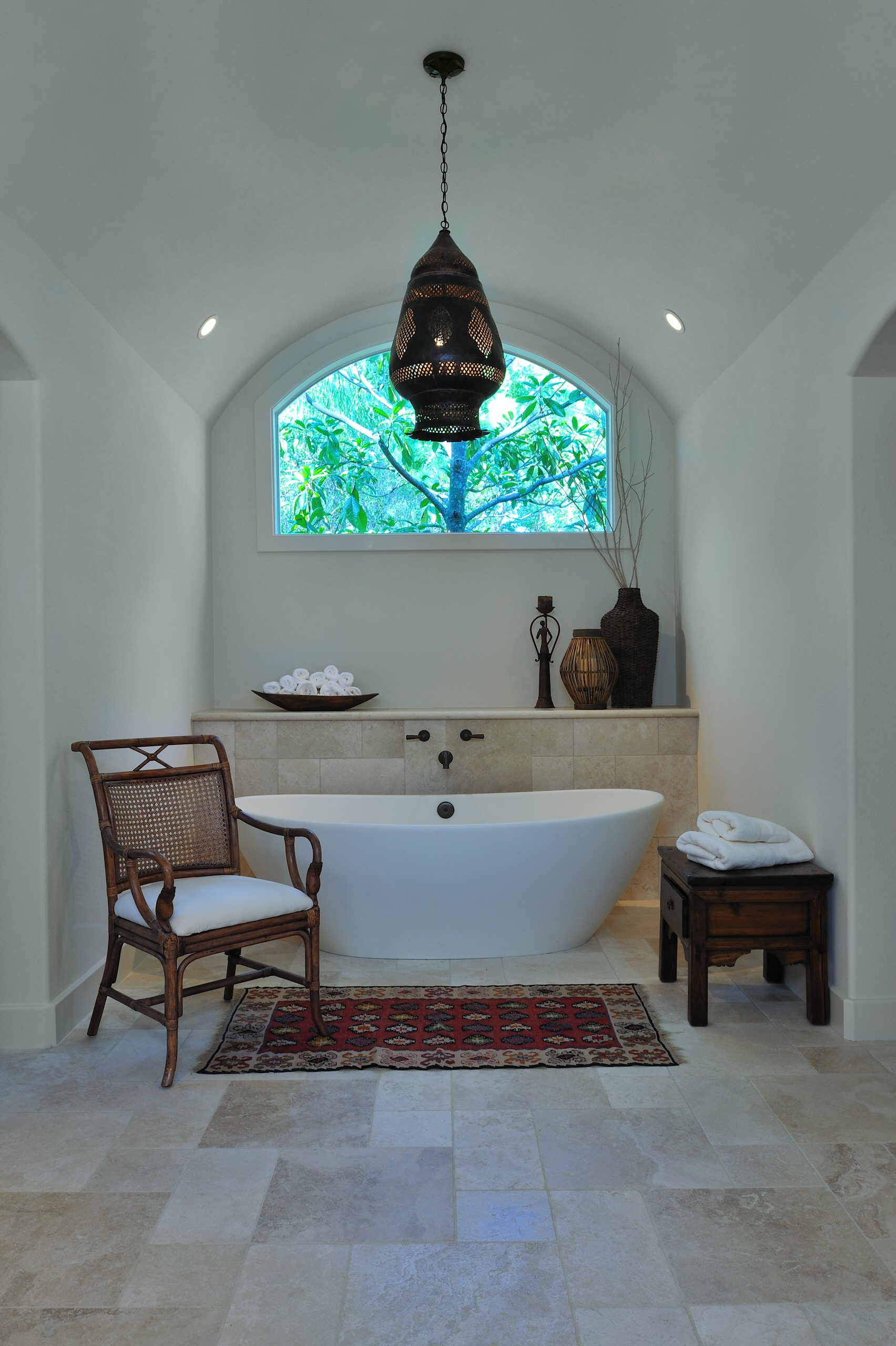 Handmade tiles are a great way to bring pattern into a Mediterranean-style bathroom, but they can be costly. To save money, look to the wall in this photo for guidance and create a focal point by installing just a strip of tile while keeping the surrounding areas in simple white ceramic.