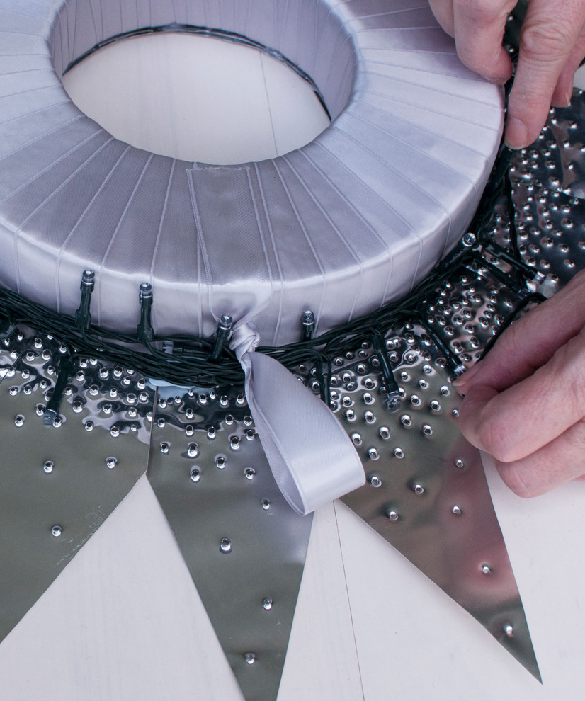 STEP 10: Round off any sharp points. Using a hook or fishing wire, hang the wreath from the ribbon loop. Switch lights on after dark.