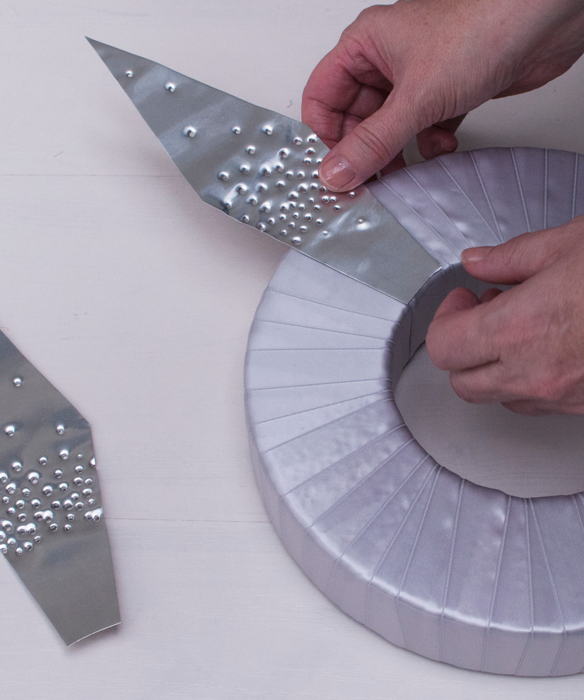 I’m not a fan of traditional Christmas colours (red and green), and designed a contemporary wreath with flashing to compliment our wide front door. The instructions and measurements below are for a regular-sized front door with the wreath spanning approximately 55cm.