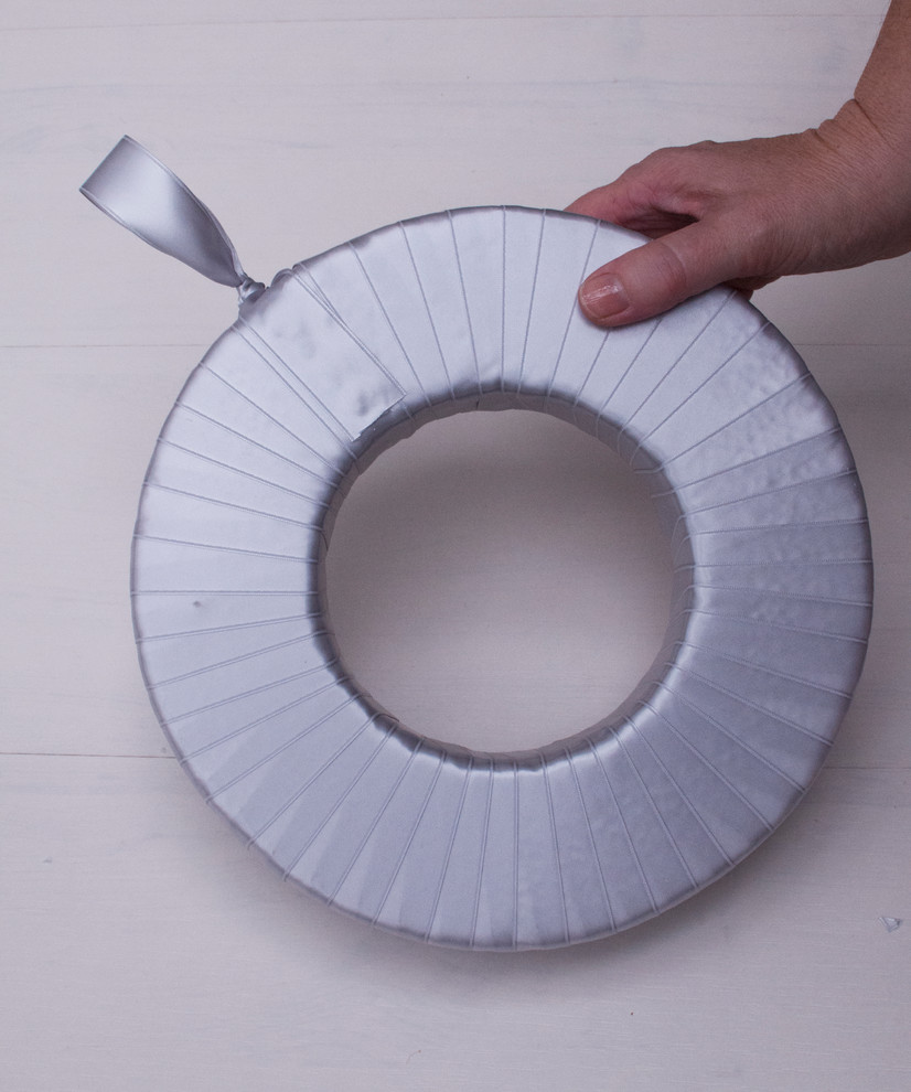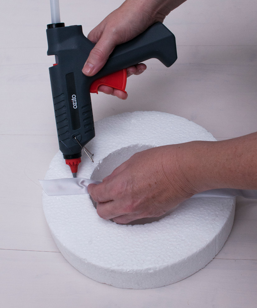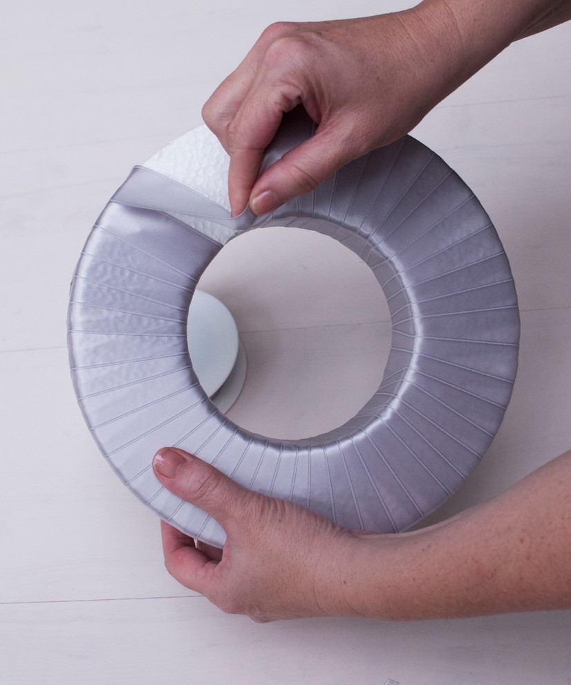 STEP 1: Adhere the ribbon to the styrofoam ring and begin to wrap around the wreath.