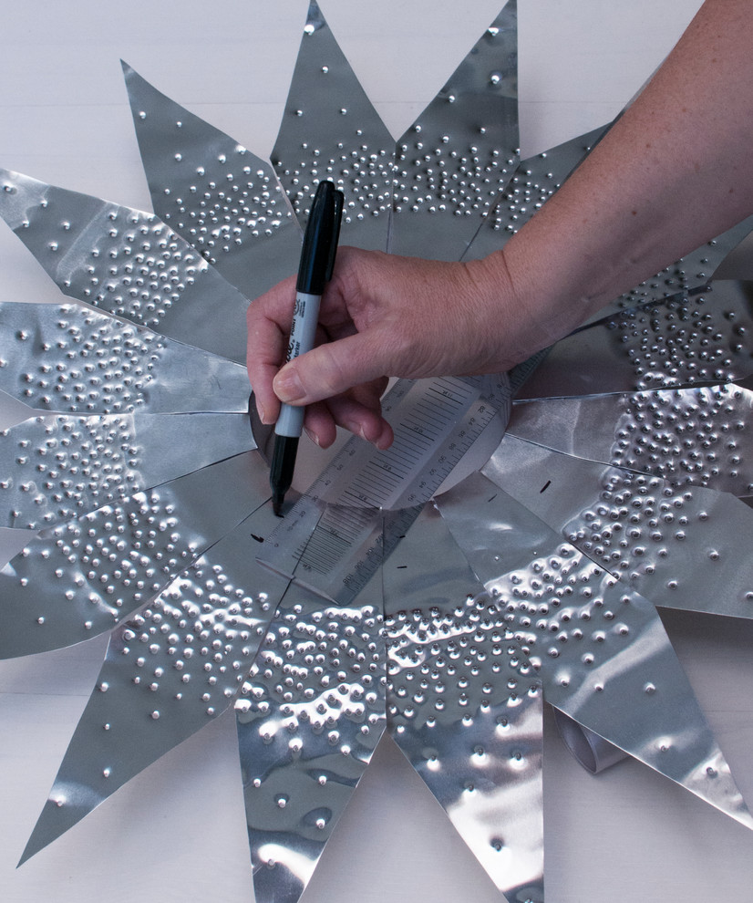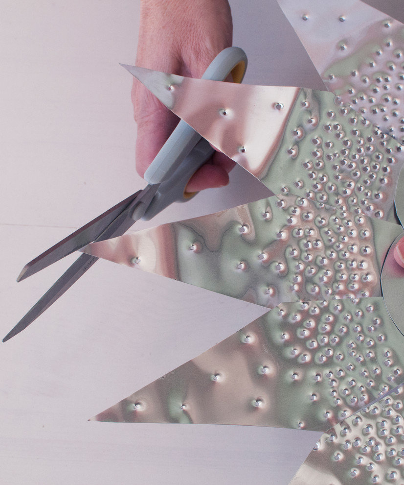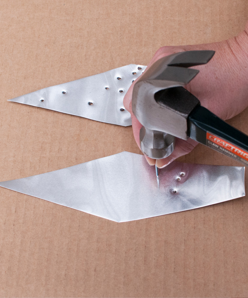 STEP 5: Using the guide, punch holes into the aluminium. Remember, the larger and/or more holes will allow more light to filter through. Be mindful that it’s best to avoid hammering the metal that overlaps the wreath. Use several layers of corrugated cardboard under the metal as you punch the holes.