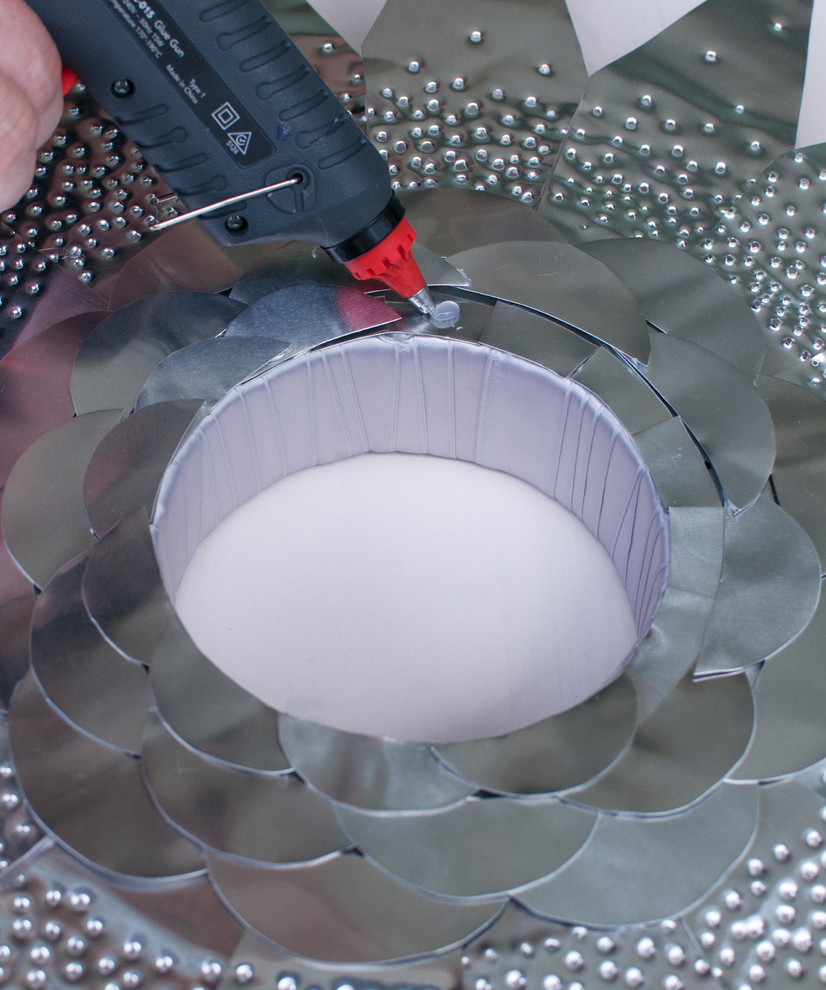 STEP 8: Starting at the outer edge, glue the large scales down first, overlapping as you go. Continue with each row decreasing in size.