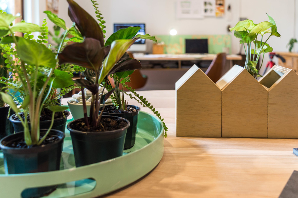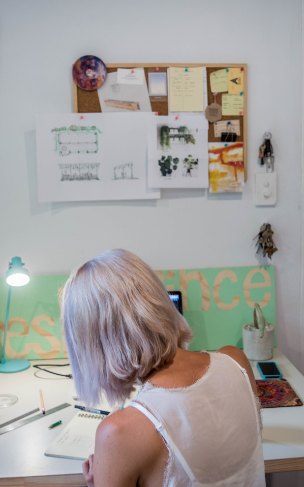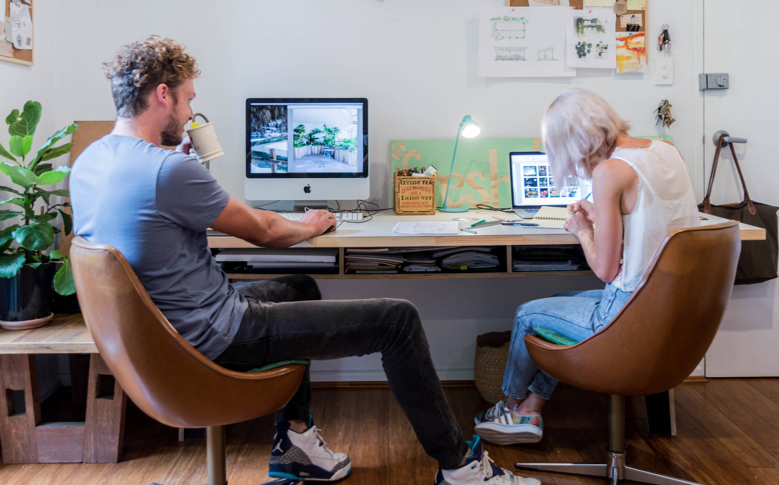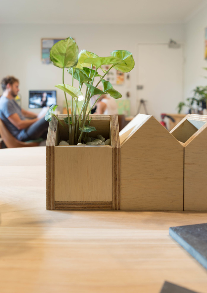Nivison and Northcott try to recycle used timber as much as possible, by building bespoke pieces of furniture throughout their space. The desk pushed up against the wall was made by Northcott, who used recycled plywood offcuts for the structure. “The oversized desk was made from scrap ply in our workshop and a repurposed door, which gave enough space for both of us to work alongside each other,” says Northcott.