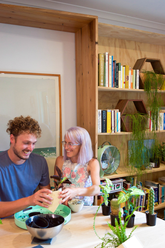 Richie Northcott and Alice Nivison are the creative couple behind Fresh Prince which provides homewares, furniture, planter boxes and large custom fit-outs to the lucky individuals around the Sydney area. They design and sometimes make their products in the sunny living room of their two-bedroom apartment in Botany. The space works for them perfectly, with a designated home office area, a large open-plan living room where they can make their designs, and a little balcony that hosts a variety of greenery waiting to be planted in the boxes.