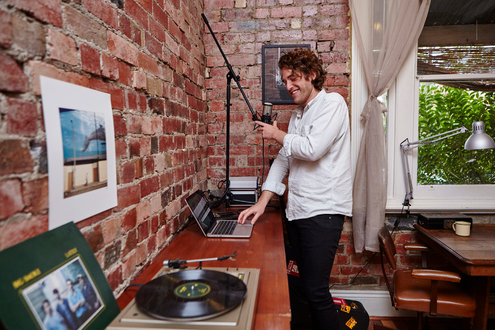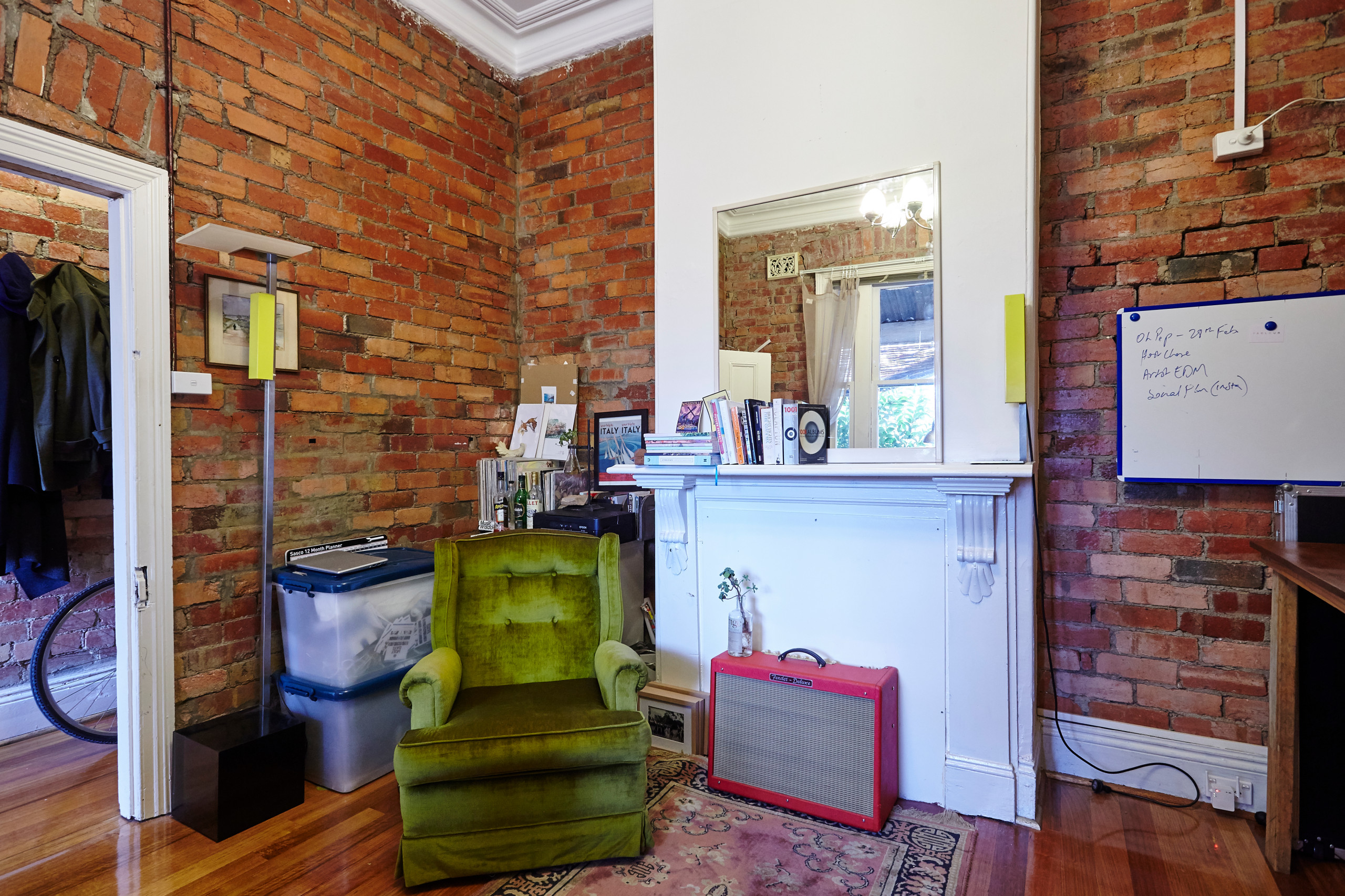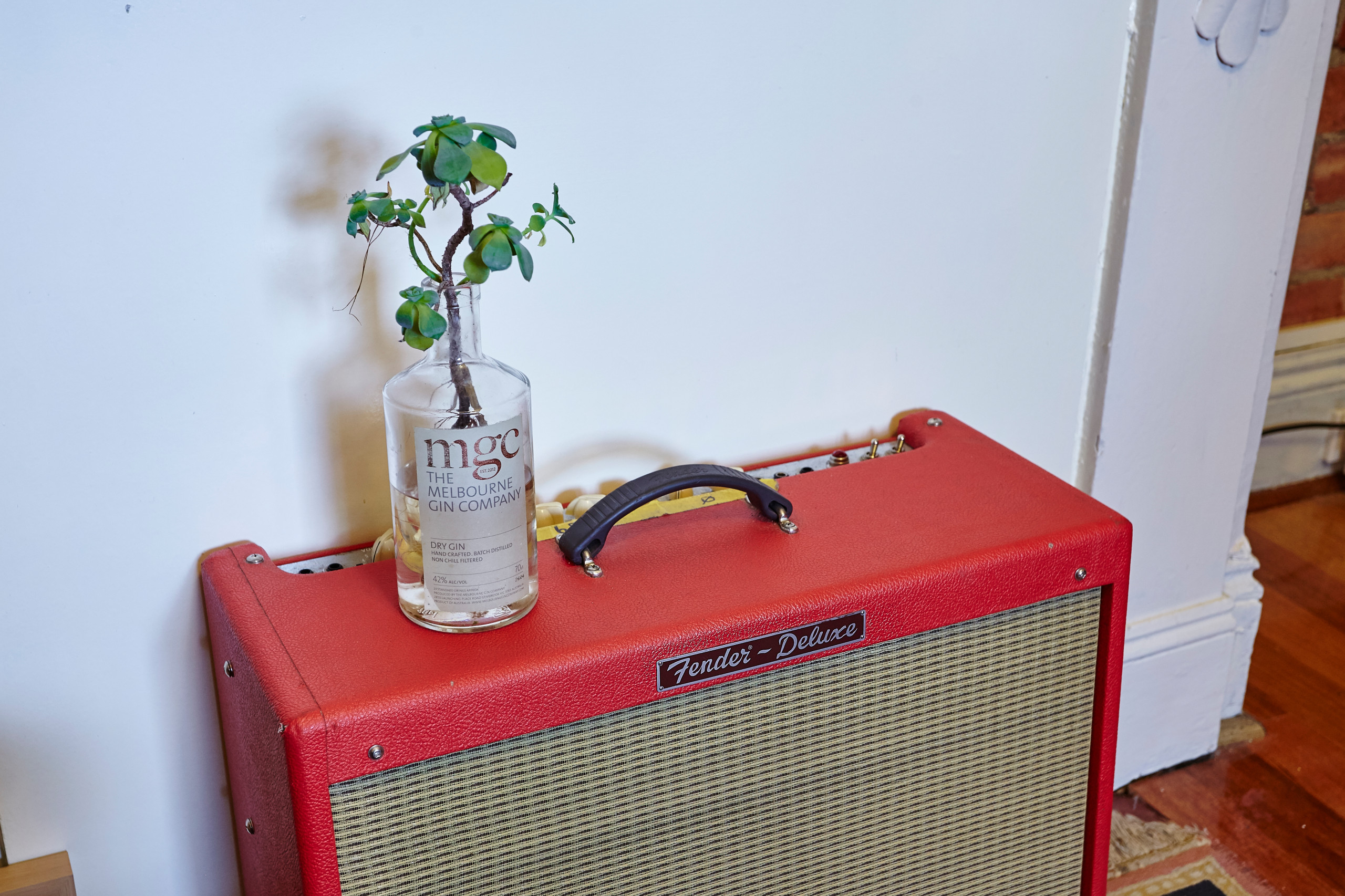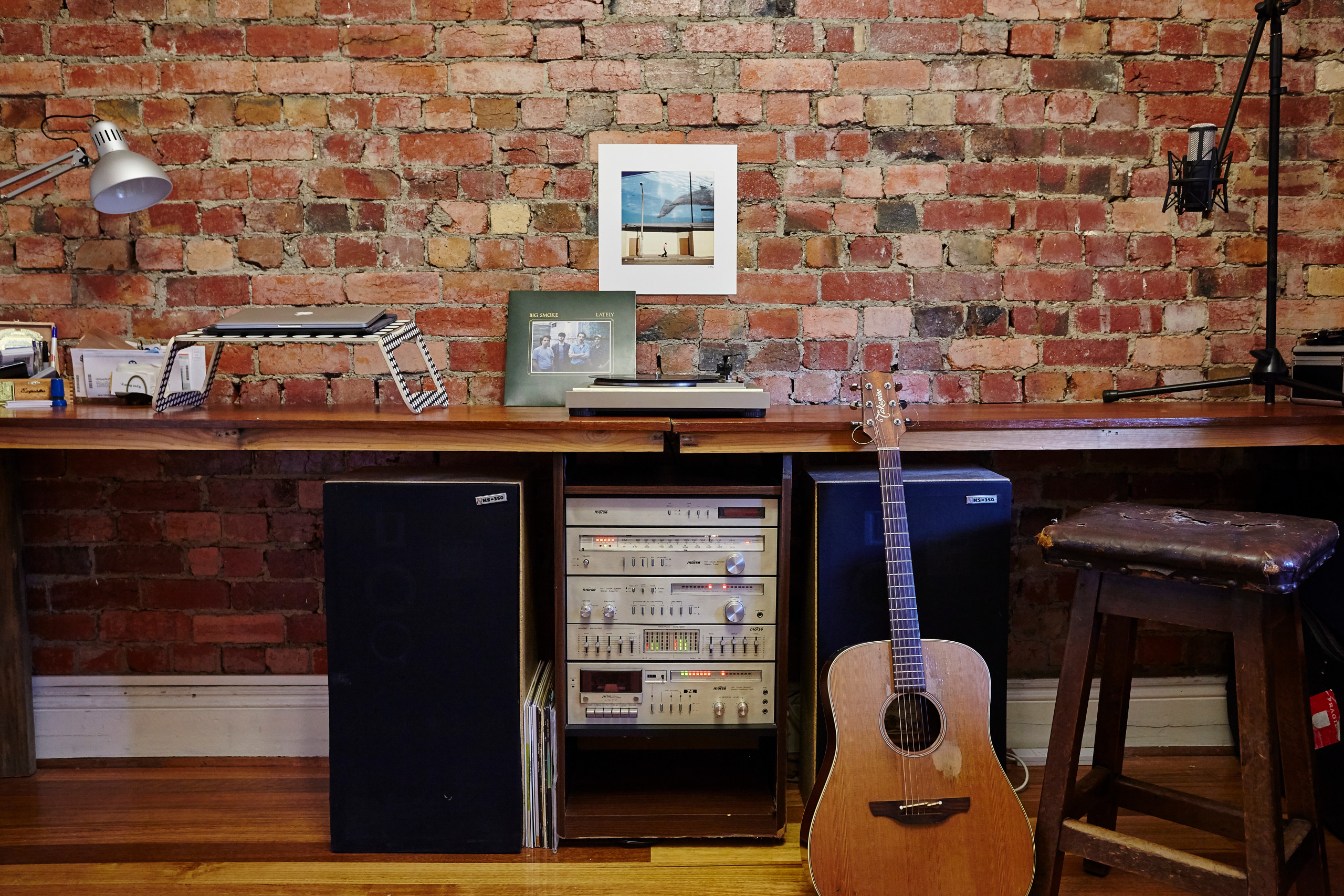 Below the mantel, the red amp (on loan from a musician friend) is used when bands come to record. The space has become a bit of a hub for musicians to meet. Walters has recorded live sessions there and tries to utilise the space as much as possible.