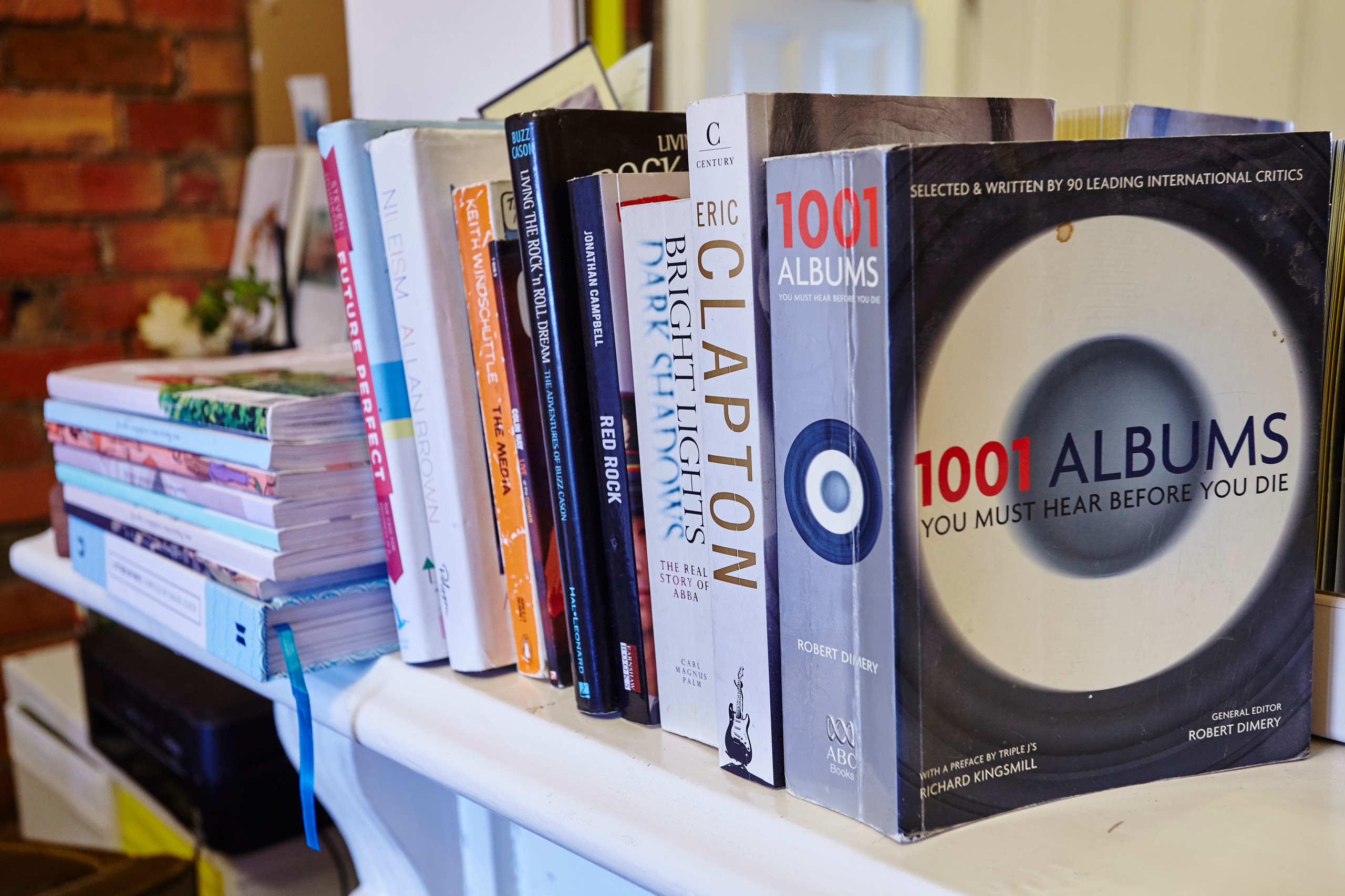 Walters admits to being a music biography junkie; he gets inspiration from reading about the music industry and musicians he admires, and keeps his books on the room’s original mantelpiece.
