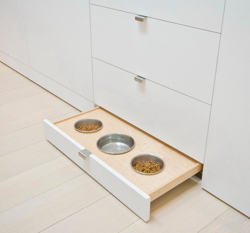 Solution: Incorporate a drawer at the base of a laundry cupboard or bathroom cabinetry unit that has been fitted with cut-outs for food and water bowls that can be removed easily for cleaning and refilling. It will be important for this drawer to be well sealed internally so that when closed, the pet food smells do not waft throughout the rest of the cupboard.
