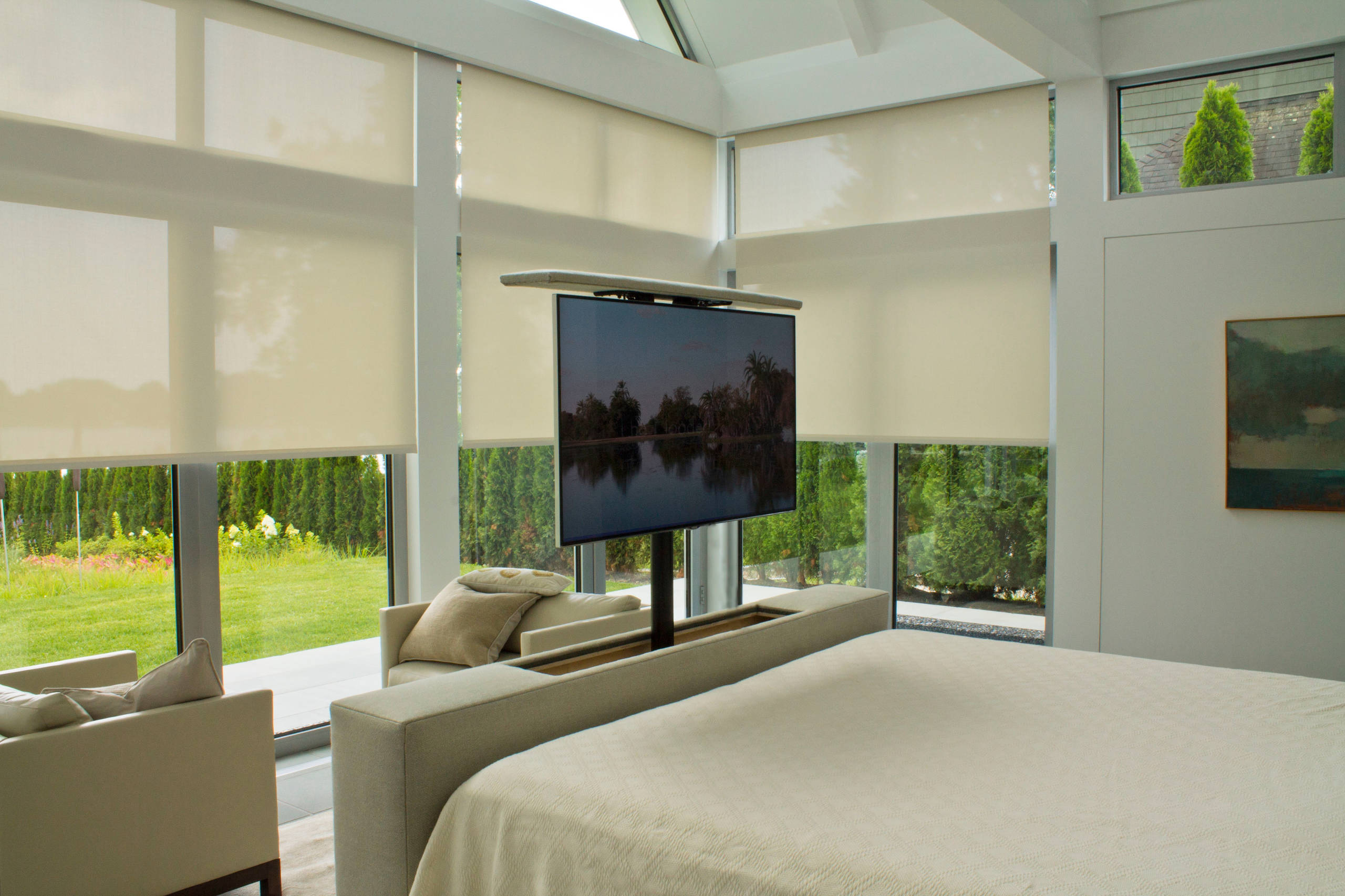 Solution: A bed-end box custom designed and made to look like the finished end of a bed or enclosed console table provides the ideal hiding place for a pop-up TV. Constructed specially to encase the unit and made to open at the top, an internal mechanism allows for the TV to lift up from inside the box to the ideal height for viewing and closes away just as seamlessly. To have the pop-up mechanism accessible by remote control or home integrated system will enhance the experience.