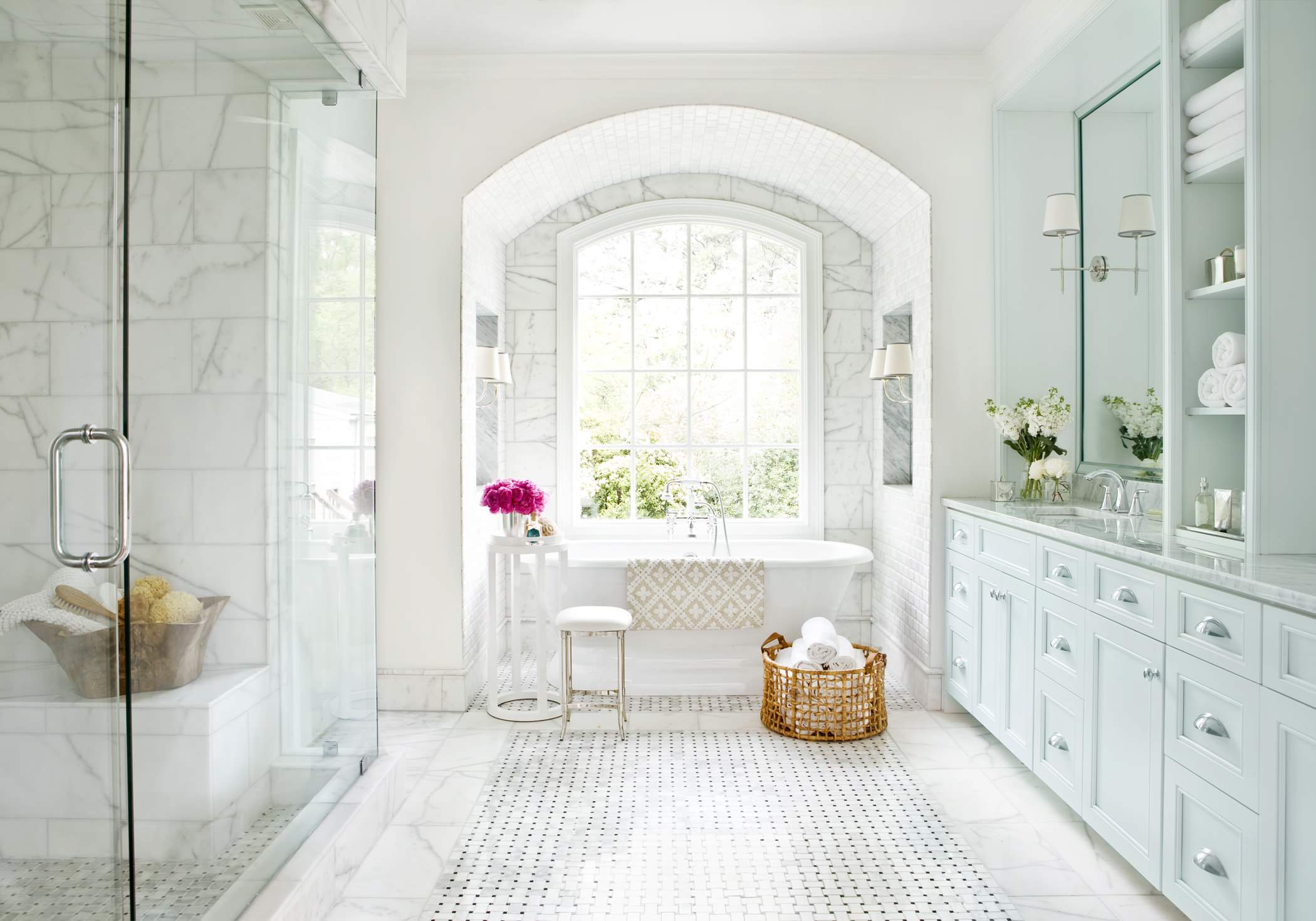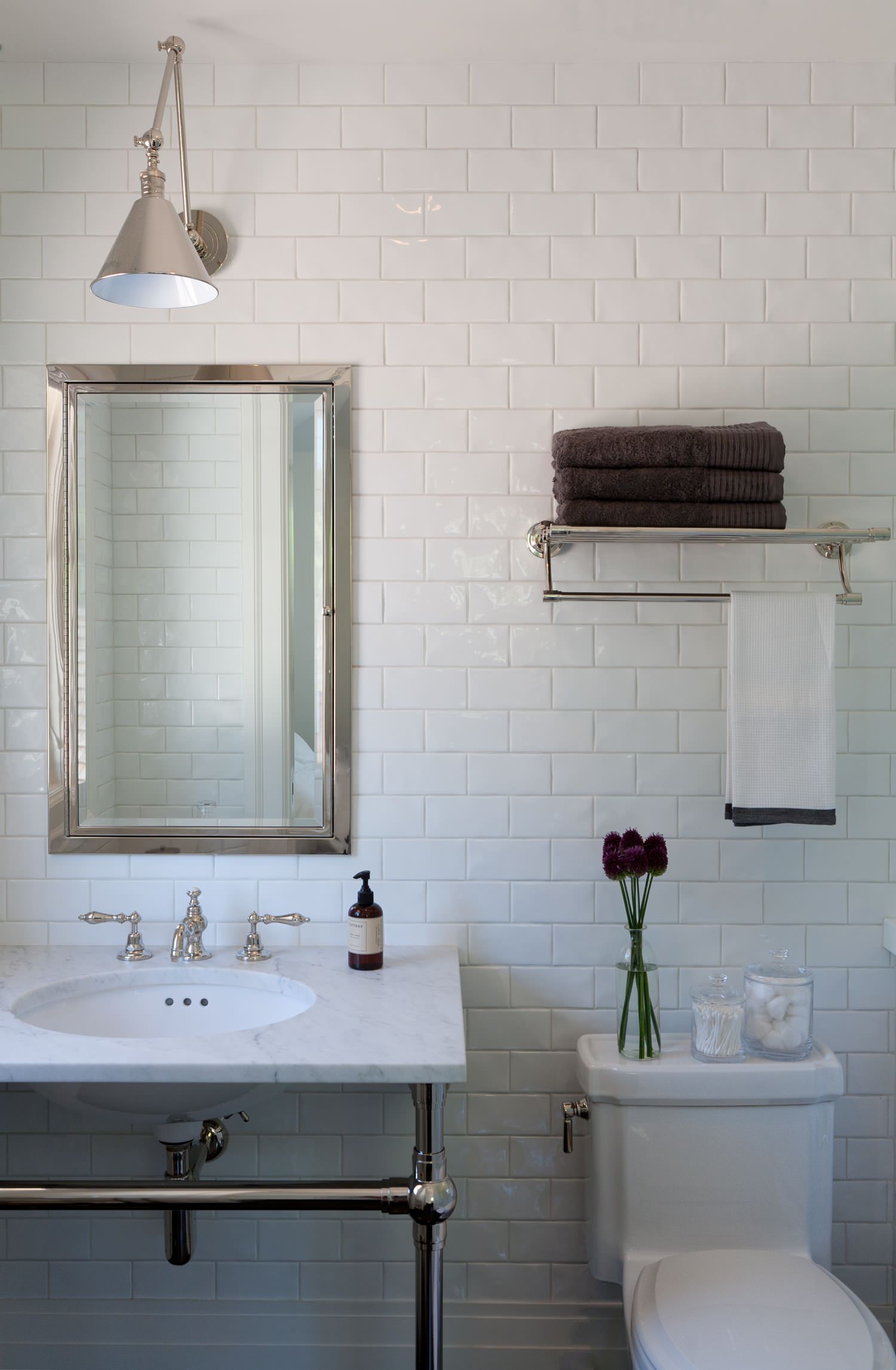 A basket. Neatly tucked under a vanity or next to the bath, a large basket of fluffy towels is warm and inviting – and easy to get to.