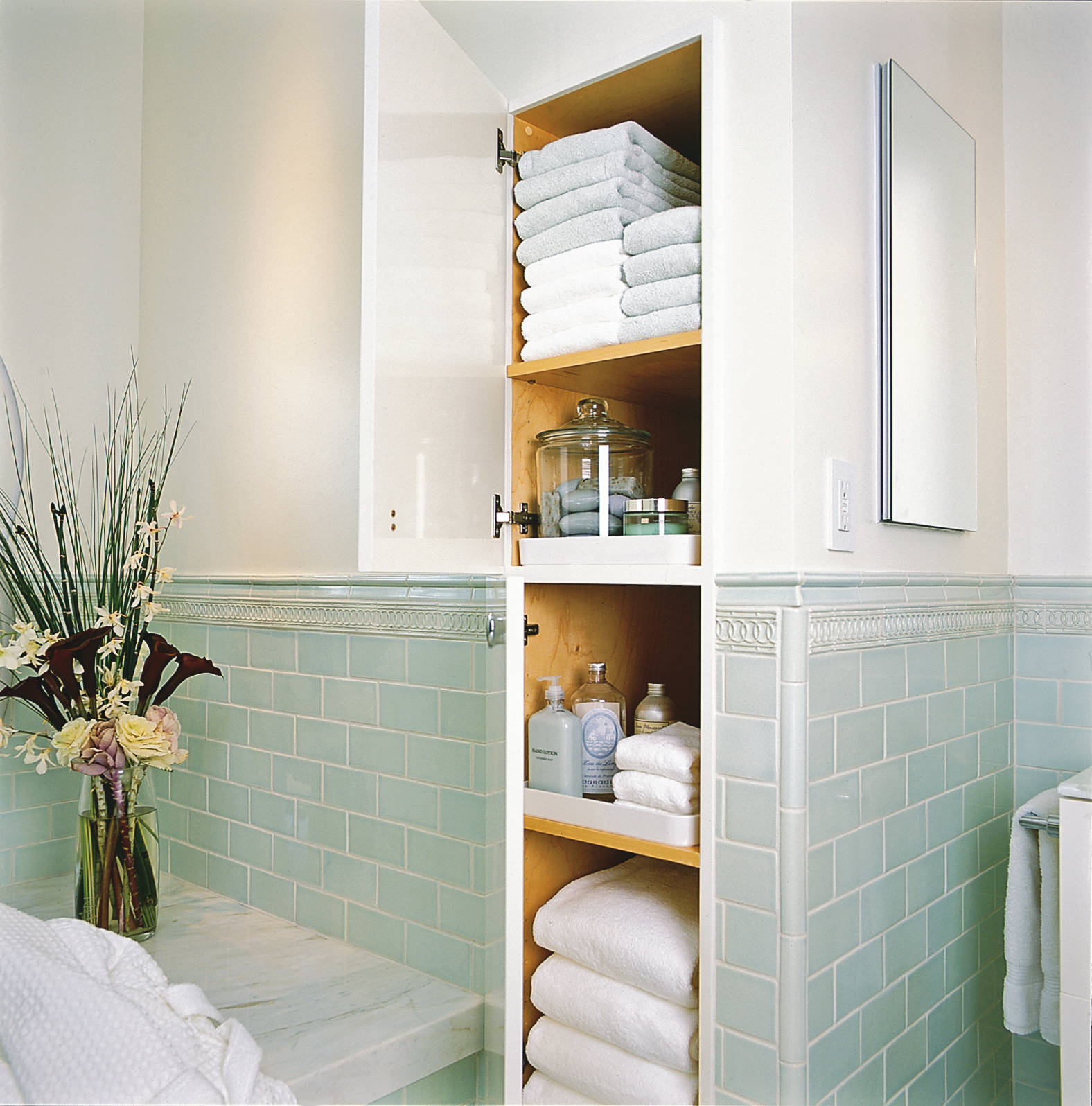 Colourful cabinetry. Whether built-in, as pictured, or a standalone unit, a colourful cabinet adds warmth to a bathroom, and provides ample room to stack, roll and store towels.