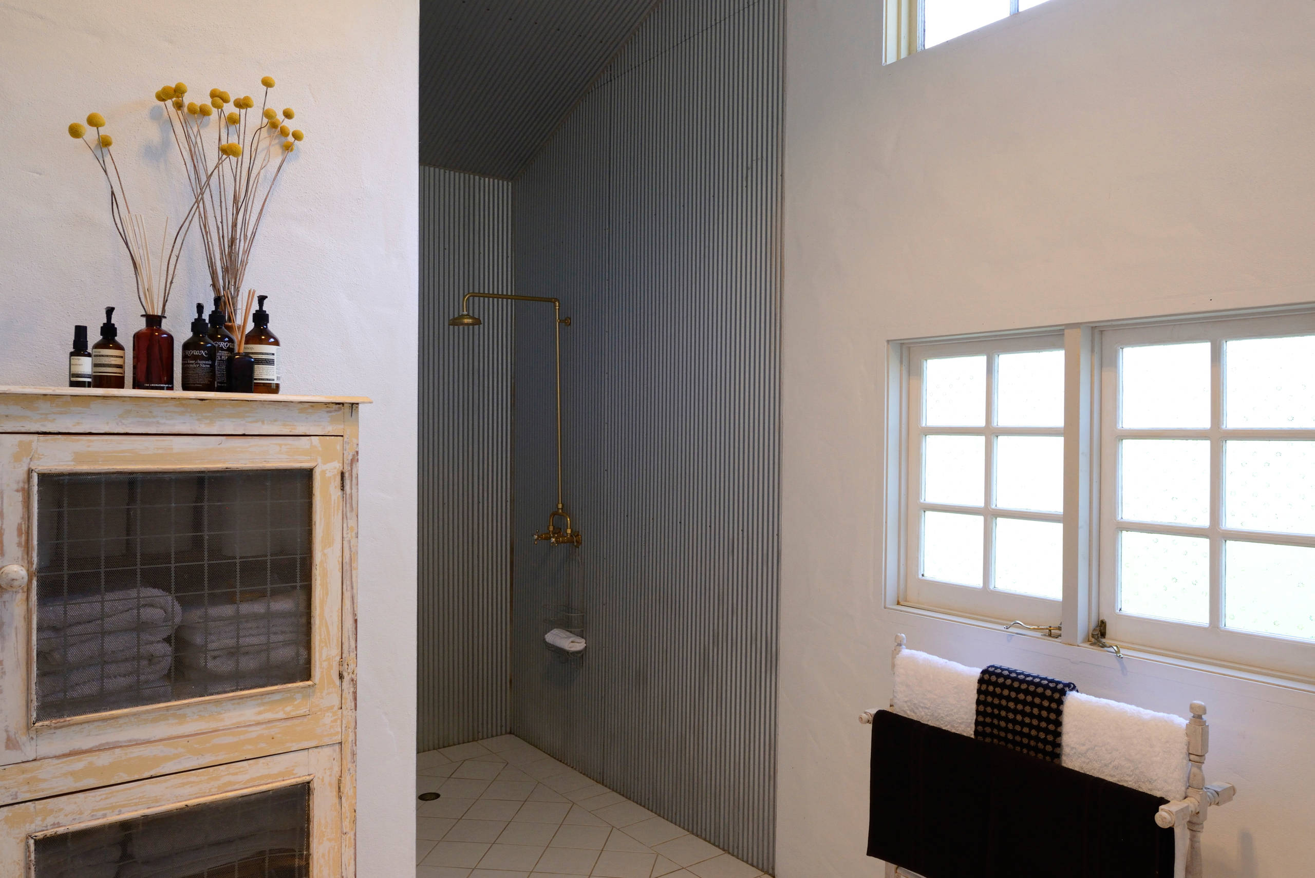 A wall-mounted towel rack. This clever rack stores a huge number of towels. Not only does it eliminate the need for extra storage in cupboards, it acts as a sculptural feature, drawing one’s eye to the clever configuration.