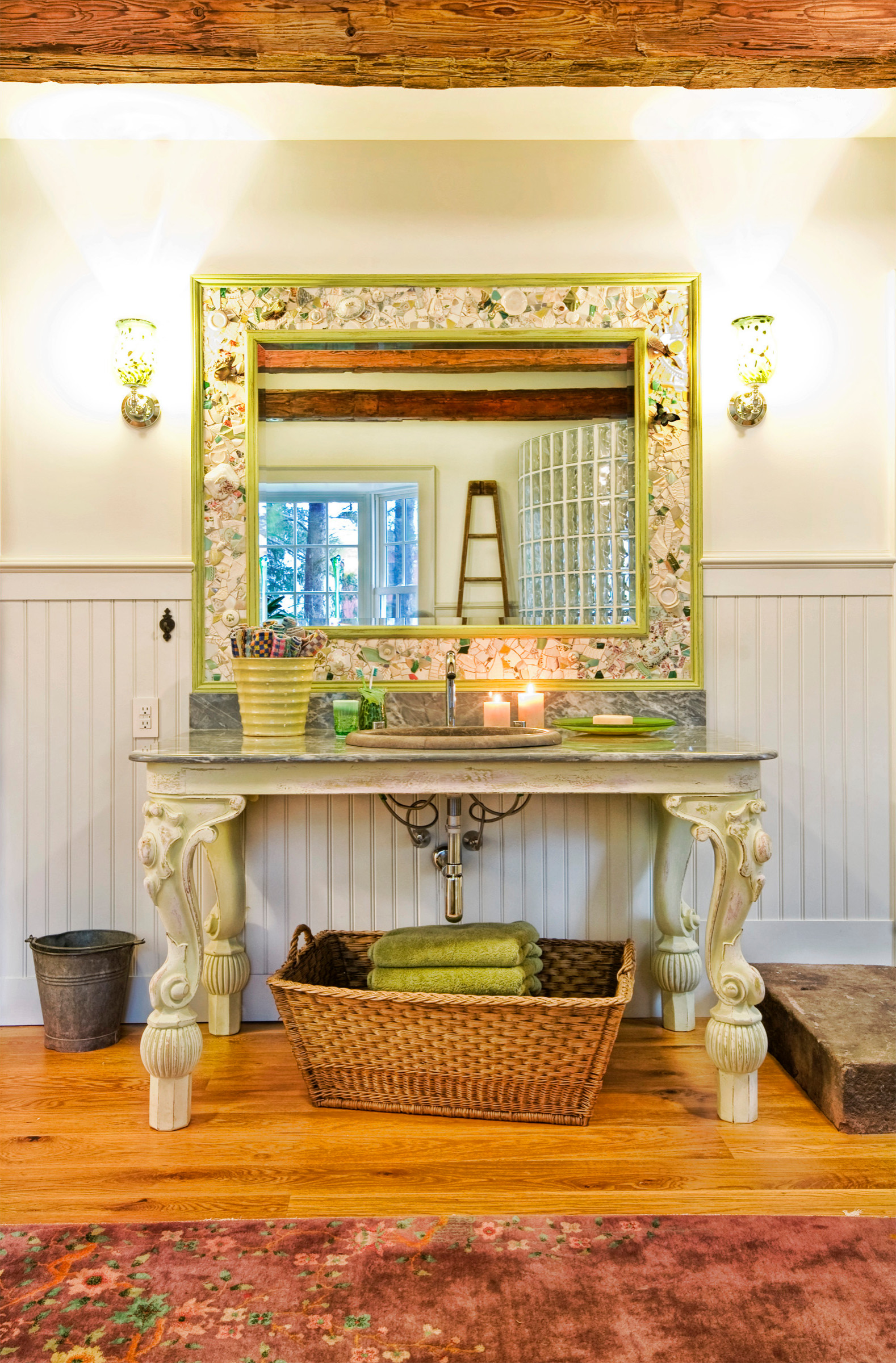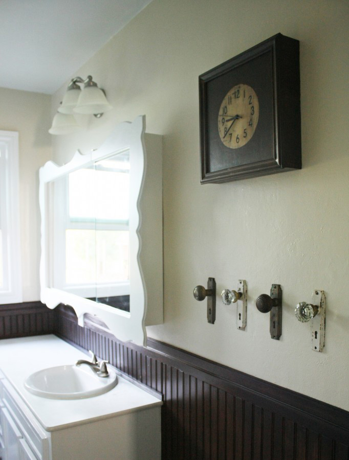 Quirky hooks. Garage sales and bric-a-brac stores are treasure troves for vintage hooks. A one-of-a-kind hook on the back of the bathroom door, next to the mirror, or grouped in a line, add a touch of charm. Don’t just rely on classic hooks, either – the old doorknobs here work brilliantly.