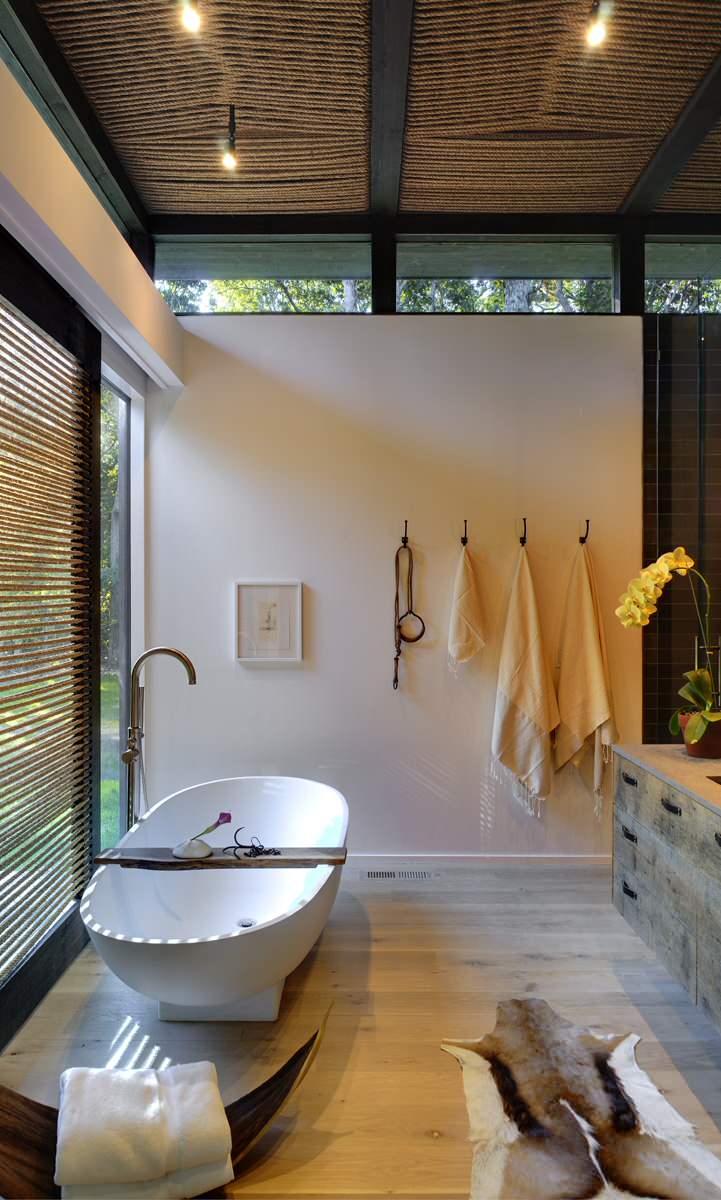A wall feature. Whether grouped on a wall next to art, as in this picture, or slung over a line of mariner’s rope strung across the bathroom wall, make the towels themselves a focal point. Be sure to include all family members – there is even a towel for the dog, here, conveniently placed on a hook next to his lead.