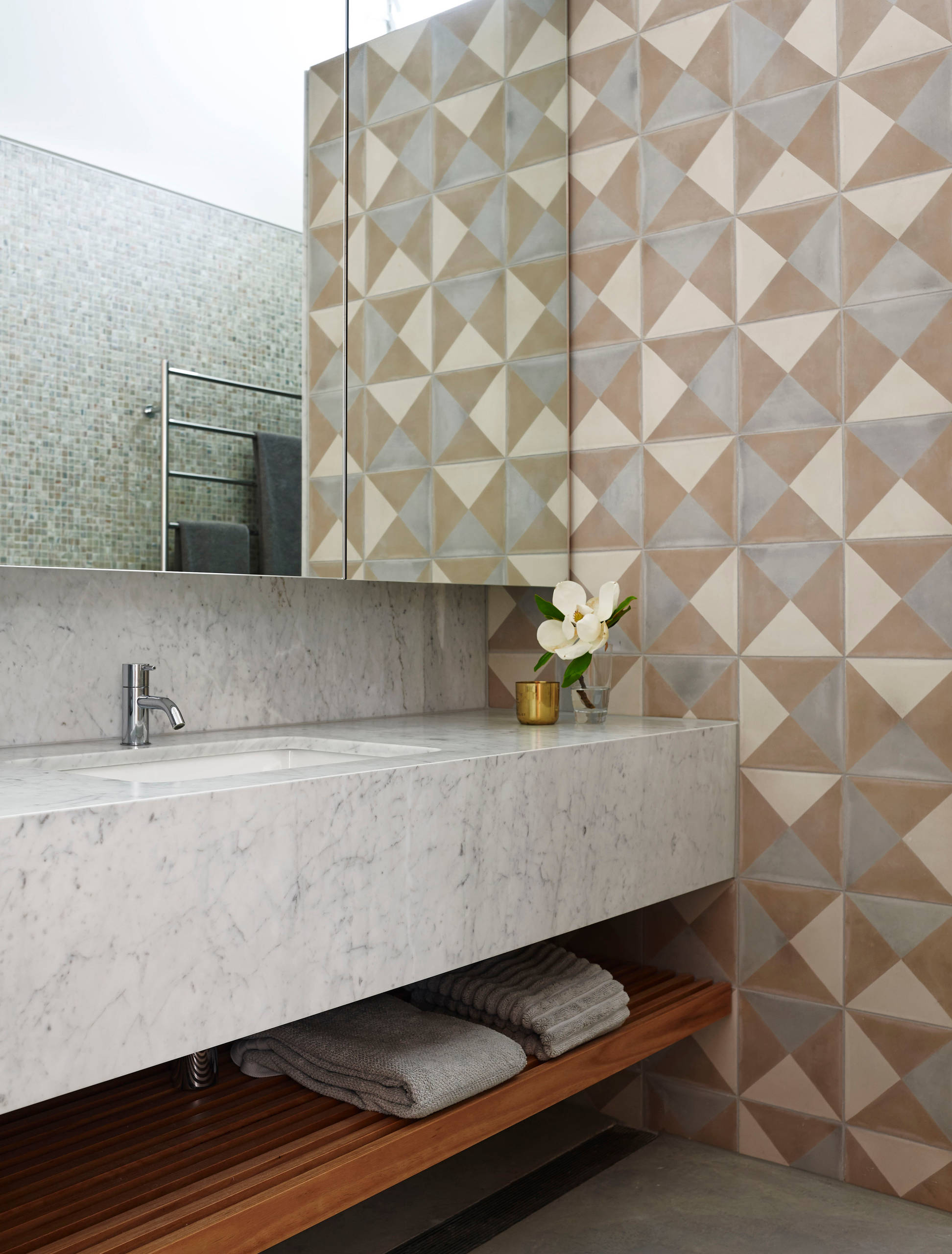 An under-mounted towel rail. If clean lines and surfaces are the order of the day, installing a towel rail (or two) under your vanity is a neat, space-saving option. A colourful, patterned or striped towel, as pictured, creates a pop of colour and warmth, and sits in a practical, easy-to-reach spot.