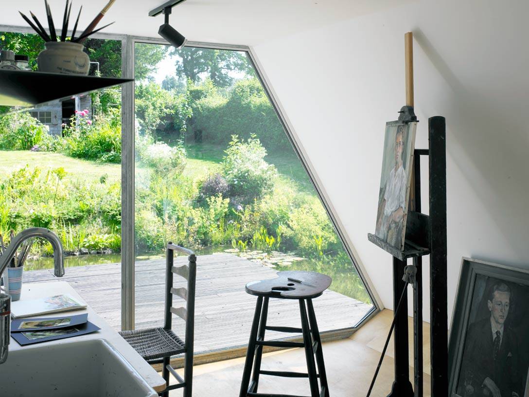 The sloping roofline of this artist’s studio gives it a classic attic feel, but in fact it’s on the ground floor, with access onto the beautiful garden, deck and pond beyond.