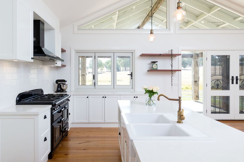 Farmhouse sinks add a feeling of nostalgia to a kitchen and bring a sense of rustic character that enhances country and traditional-style kitchens. Complete the look by pairing your white porcelain farmhouse sink with beautiful traditional tapware, which is often available with matching white porcelain handles, as shown here.