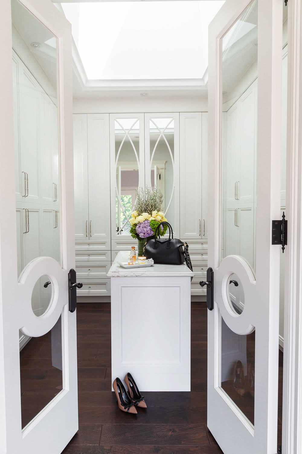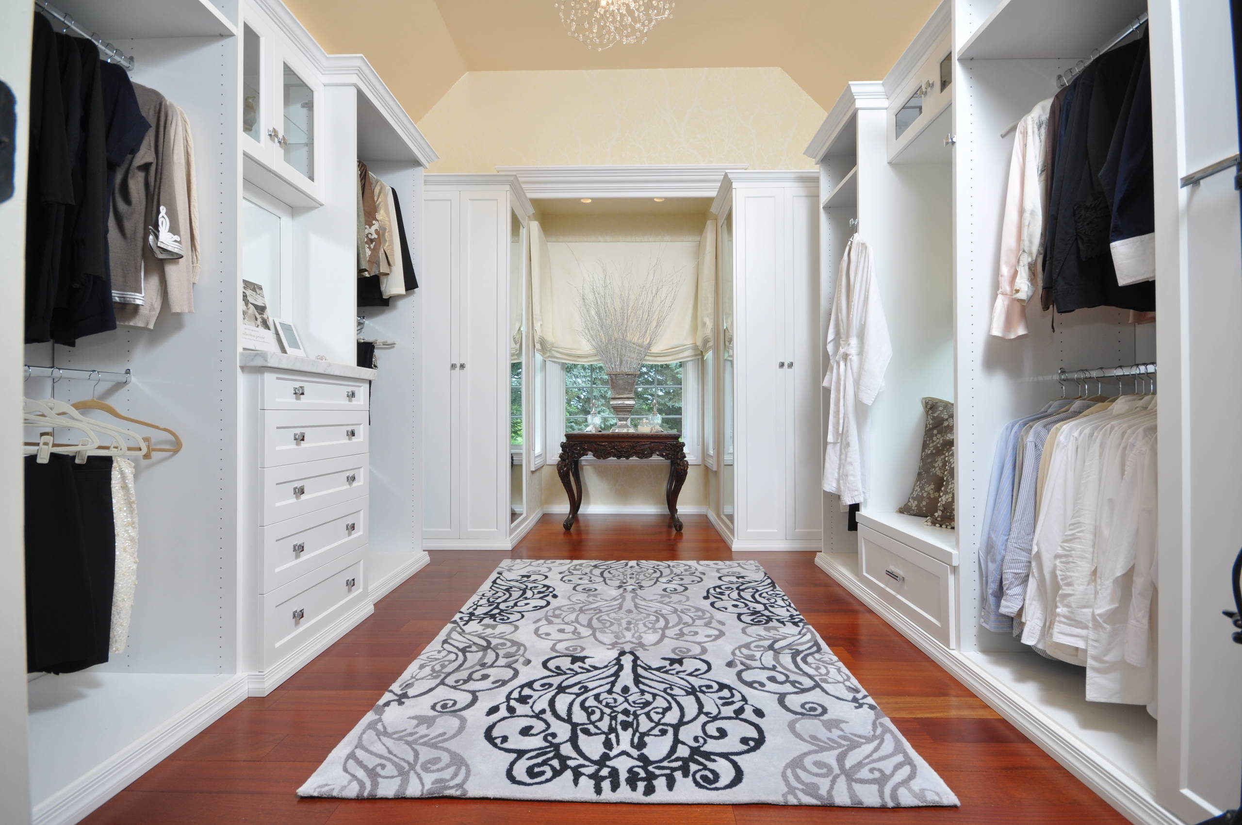 A room of this size also offers the luxury of decorative panels and mirrors on cabinet doors, as well as soft furnishings such as rugs, seating, curtains, lamps and dressing tables.