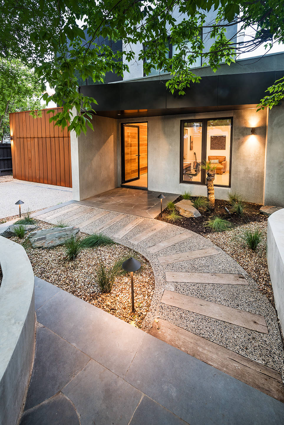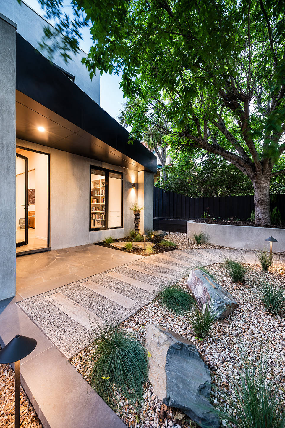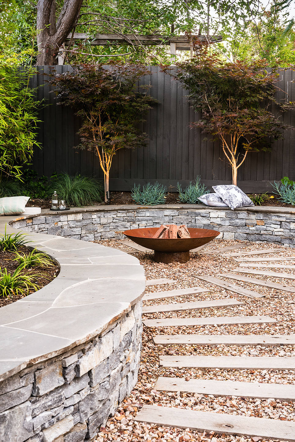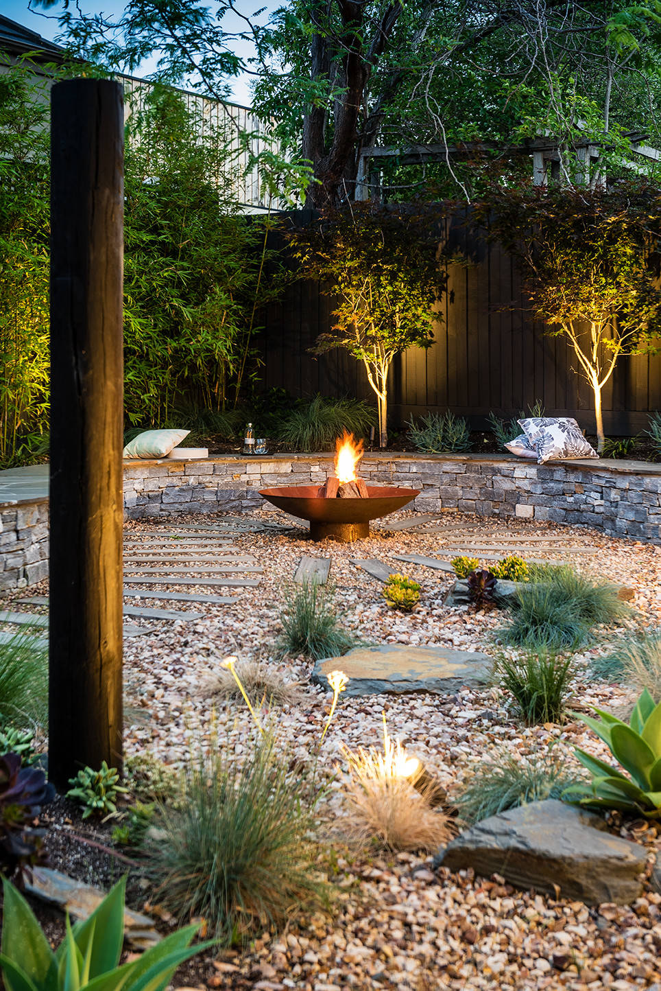 The clients wanted a raw and natural palette, to bring a sense of nature inside their city-dwelling home (the rear wall of the house is floor-to-ceiling glass). An area to gather around a fire pit was a necessity for entertaining and connection. They also wanted a garden that was relatively low-maintenance and provided a space to relax both outside and inside the home.