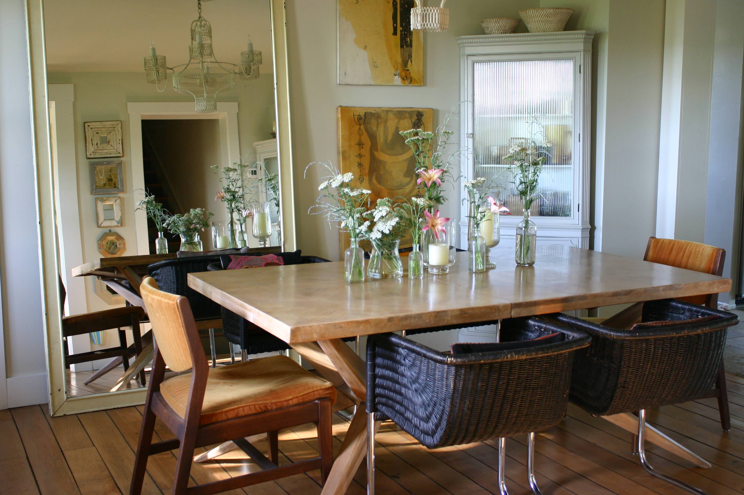 Fill different sized glass jars and bottles with flowers for a romantic table display. If you are short on freshly cut flowers, try using fragrant herbs from the garden.