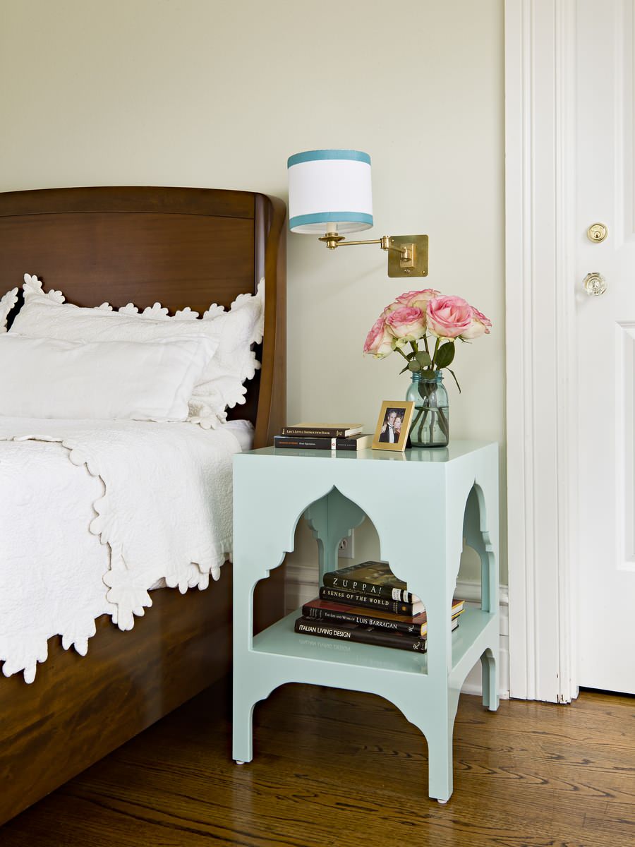 Use an old jam jar to hold beautiful cut blooms on a bedside table for a welcoming atmosphere in a guest bedroom.