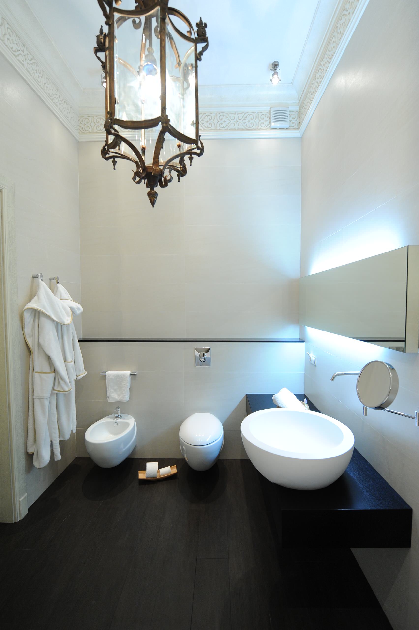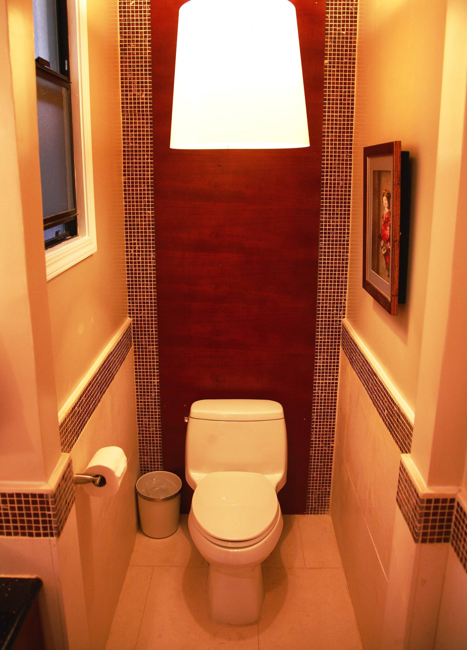 Another toilet niche is treated to a beautiful accent wall at the back and a pendant lamp above. Adding some nice artwork creates a pleasant environment. And why not? You might be here for a while.