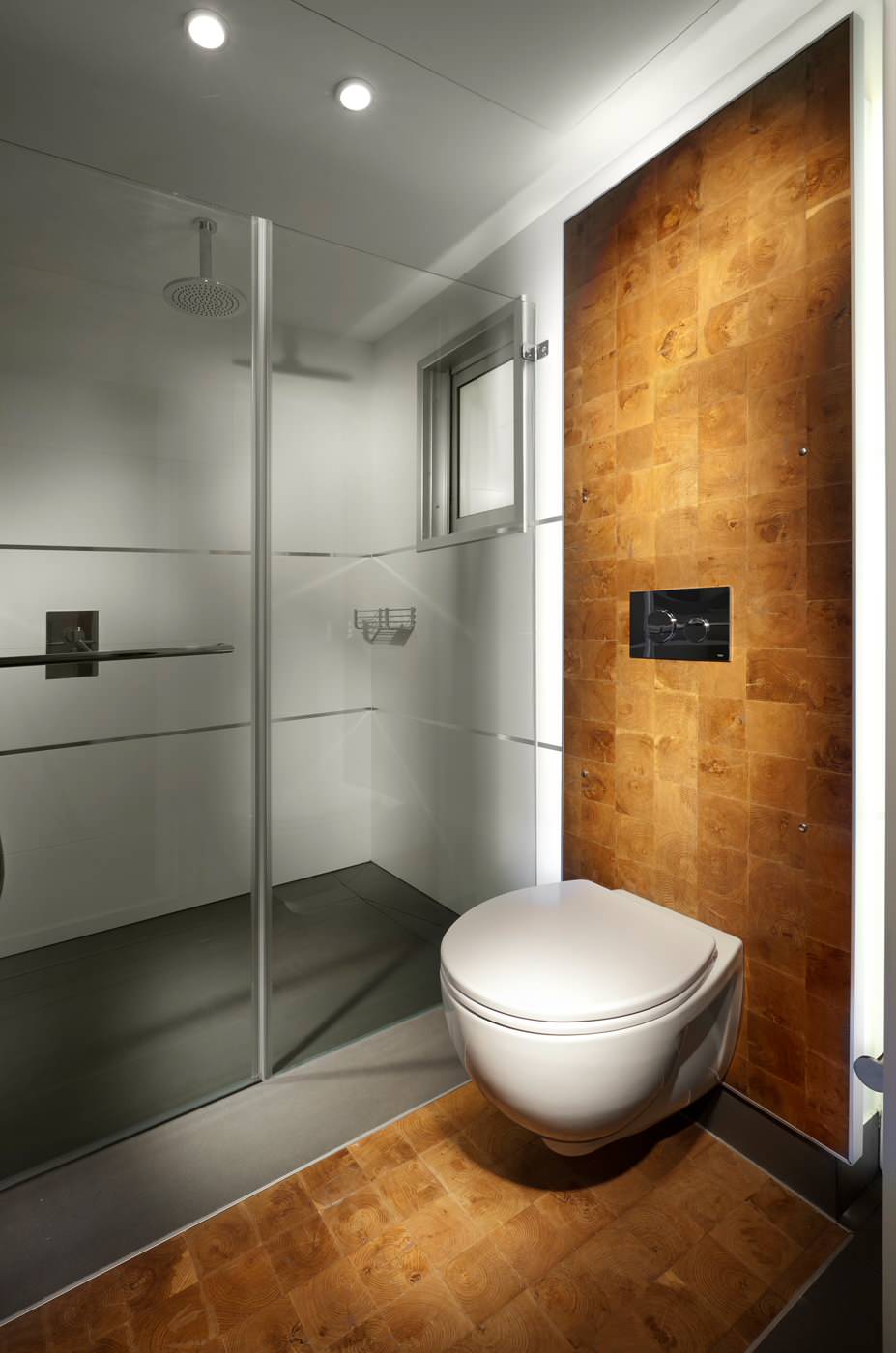 This entire bathroom is gorgeous! But I think the designer pulled out all the stops in the area occupied by the wall-mounted toilet and bidet. That live-edge wood floor meeting up with the tile is so beautiful, I can hardly take my eyes off it.