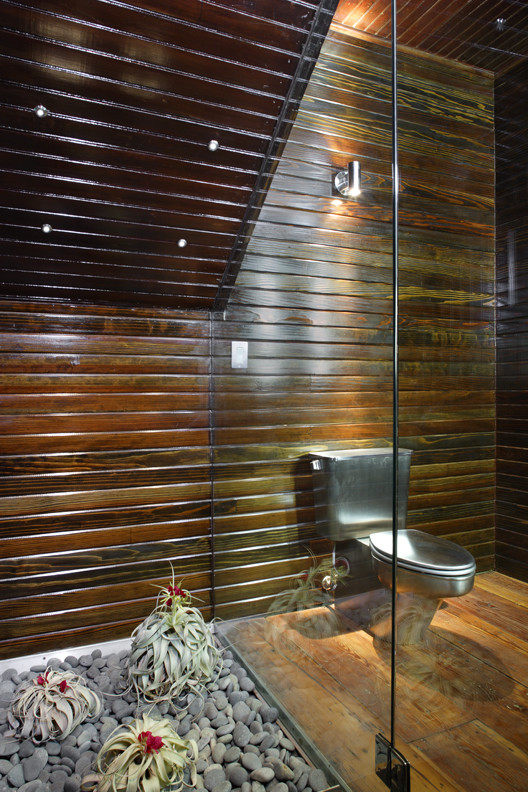 This gleaming stainless-steel toilet is a real standout against the wood walls and floor.