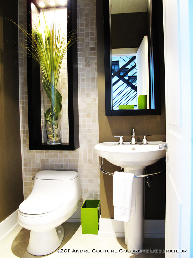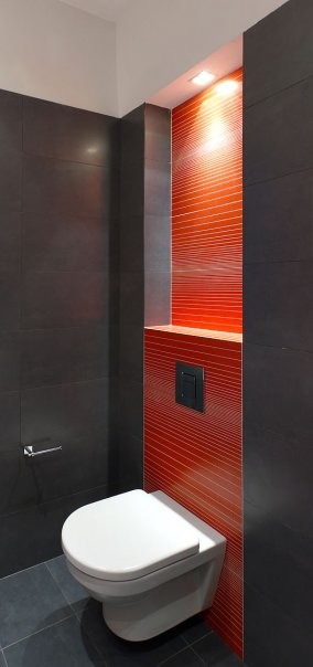 The bold, red tile behind this contemporary wall-mounted toilet calls attention to this area and creates artistic interest. So often, a bathroom has beautiful tile around the vanity and shower, but it completely fizzles in the toilet area. But this designer carried the theme all the way through this bathroom, ending up with a complete and balanced look.