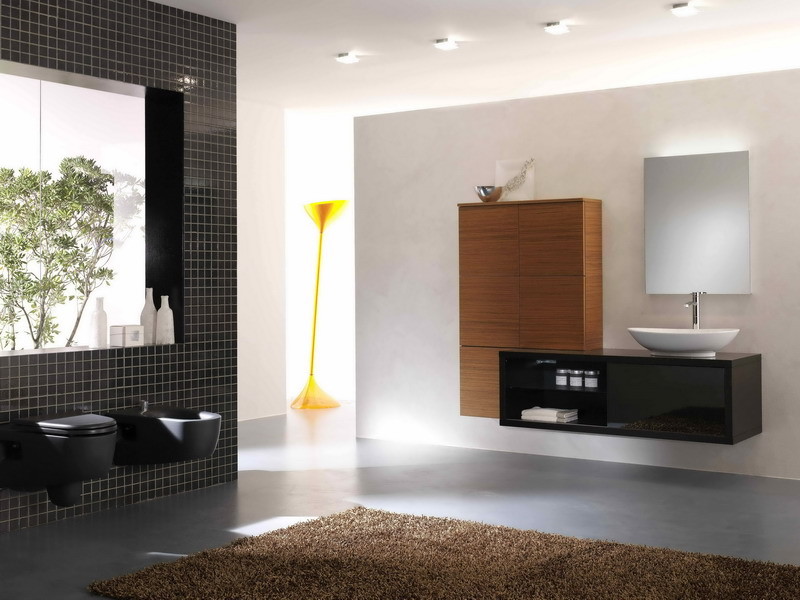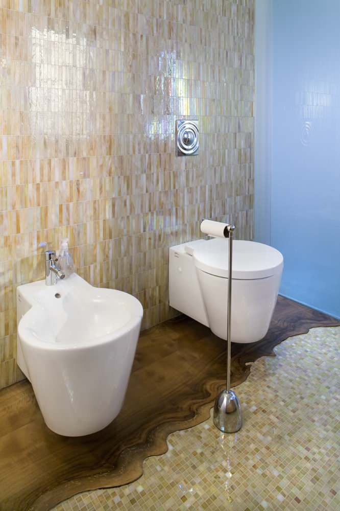 When choosing where to place a spectacular tile mosaic, why not consider the wall by the toilet? This ultra-contemporary and minimalist toilet style is the perfect foil to the exuberant dance of colours in the mosaic.