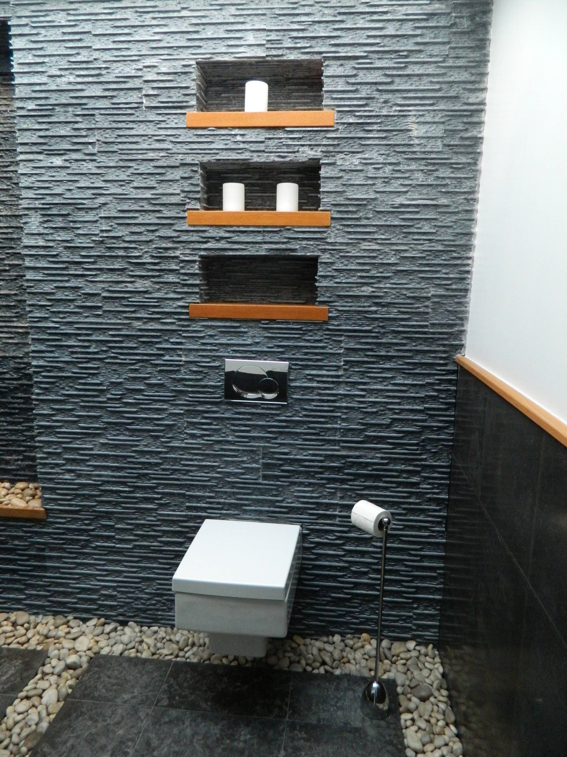 The accent tile here heads across the floor and then wraps up the wall for a strong architectural look. The smooth, round shape of the toilet is a nice contrast to the straight lines in the rest of the bathroom. The toilet is proudly centred upon the strongest design element in the room.