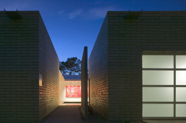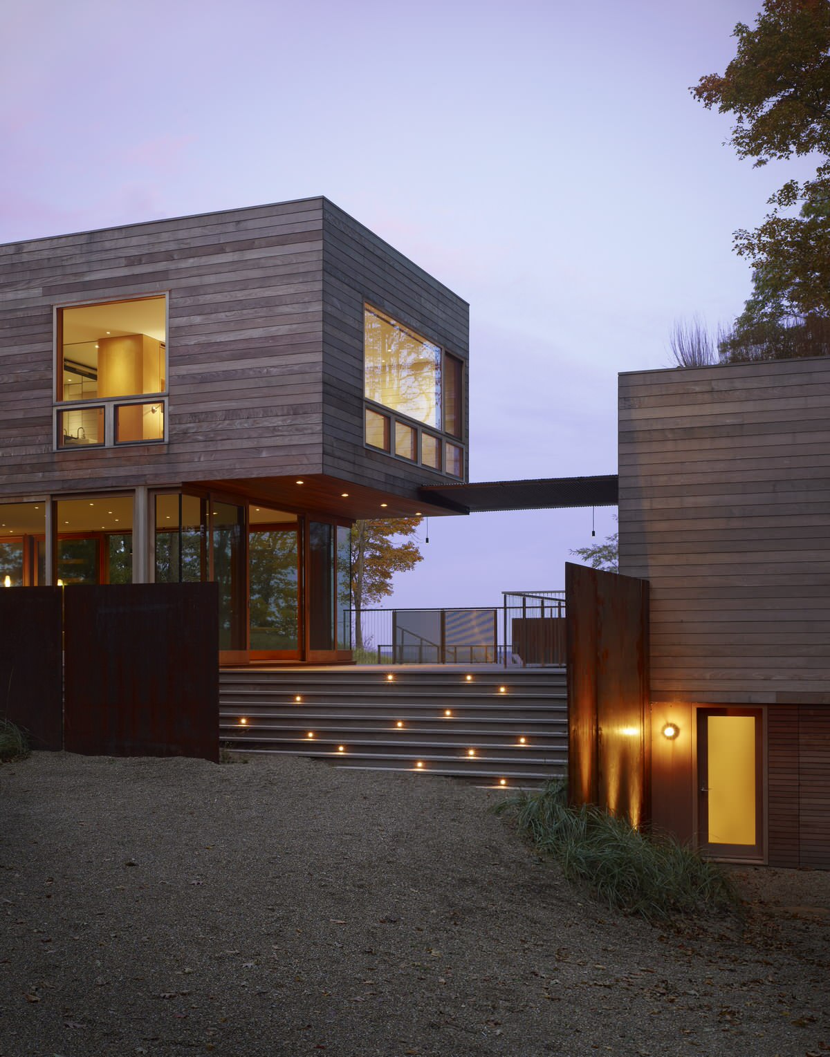 Light naturally draws us in and suggests refuge. This concept can be put to use in any part of a home, but it’s especially effective outside, to announce entry, establish gathering points and suggest hierarchy among building components. I really appreciate how the ambient light emanating from this garage is enough to bridge the gap between arrival and entry without the need for intermediate path lighting. This further enhances the destination lighting.