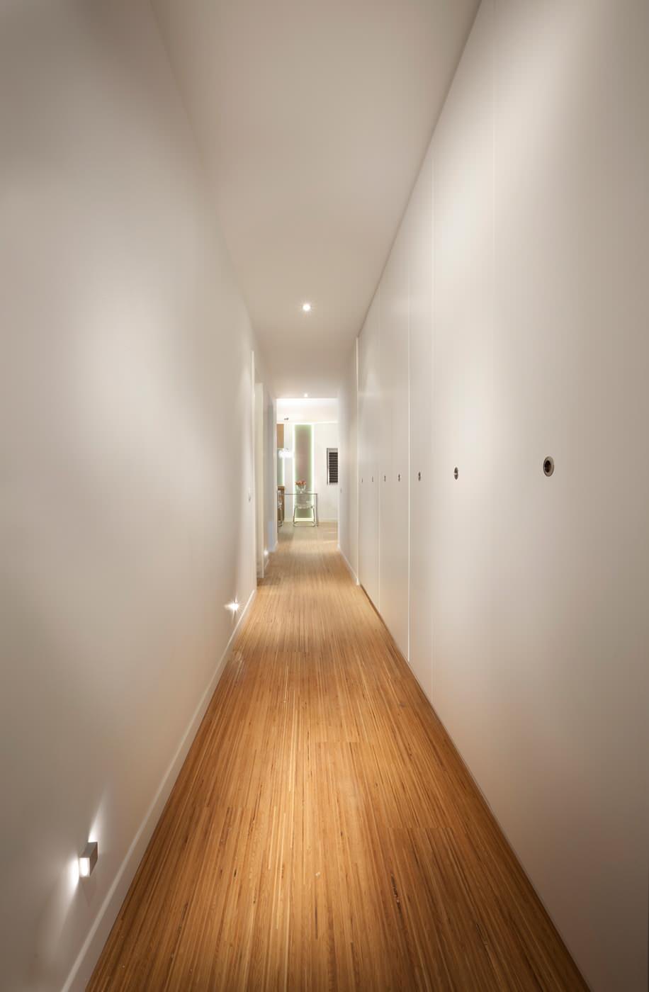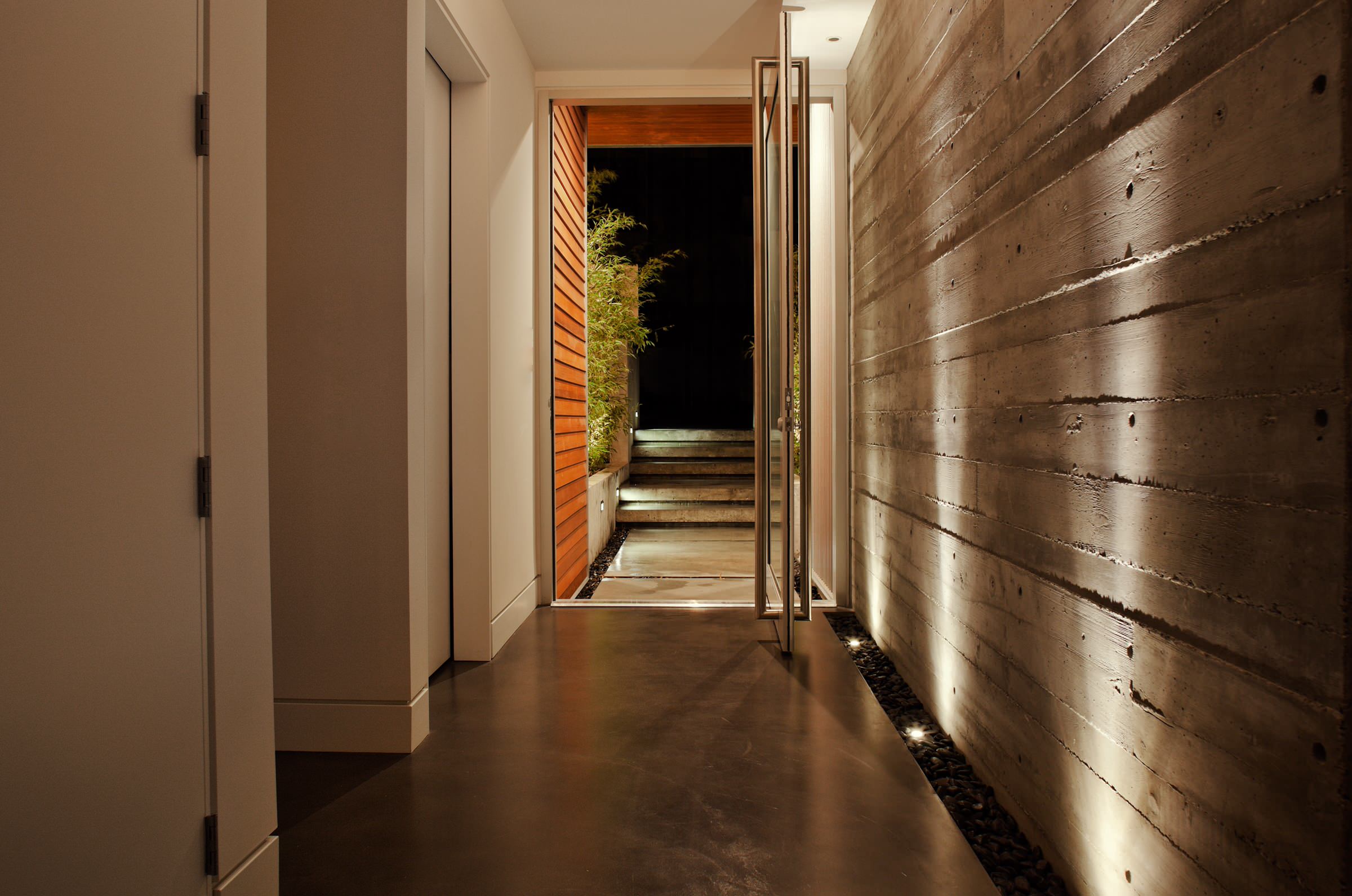 Here an embedded linear light draws a line to the home’s entry. Vertical windows at the corners wash the walls with light, and the interior windows suggest a welcoming home.