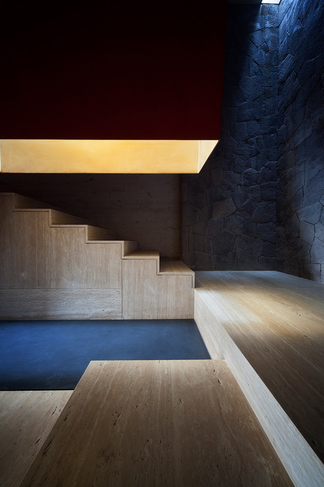 High levels of contrast in a lighting scheme allow this technique to work here. The light filtering in from above promotes a feeling of quiet reverence, seclusion and contemplation.