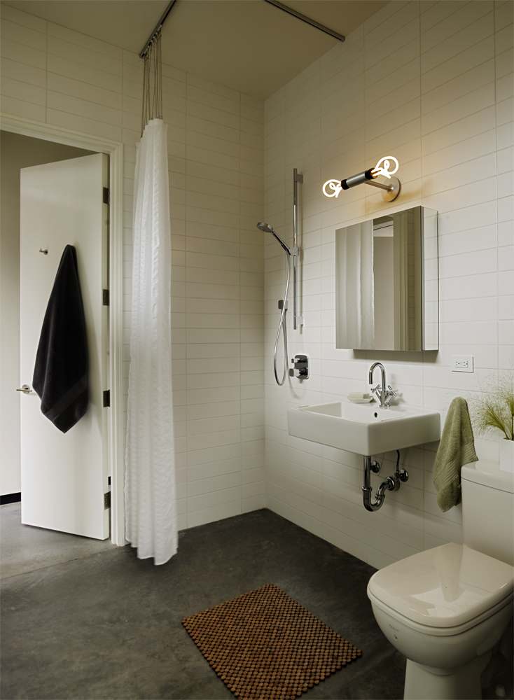 While the bare bulb may not be appropriate for every space, it is in this bathroom. This is a place where lighting one’s face is essential and the omnidirectional light from the exposed lamp works well.