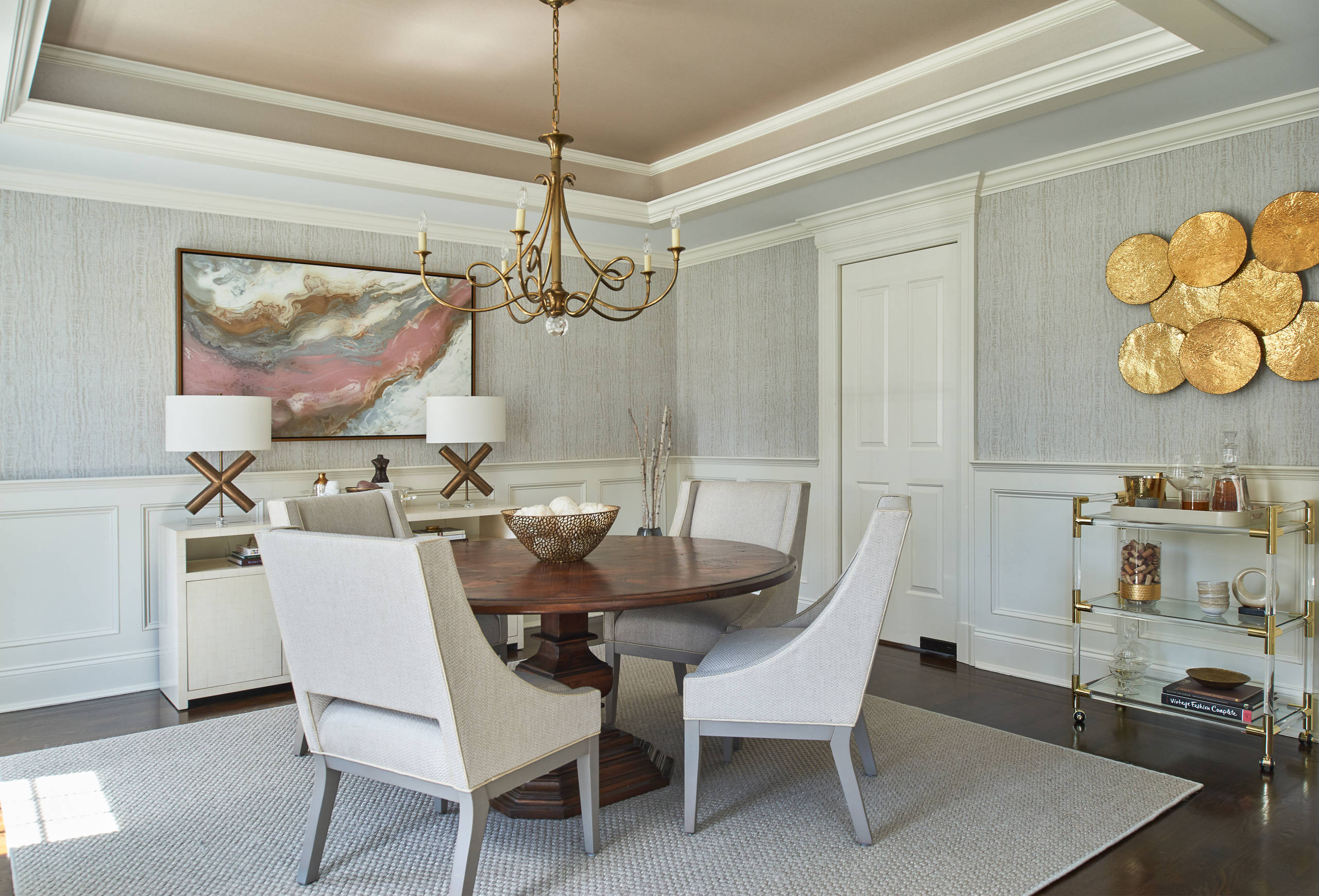 The idea of tinting paints to match can work in reverse as well. In this dining room, the dark paint treatment in the ceiling cove highlights the architecture and makes the room feel more intimate.