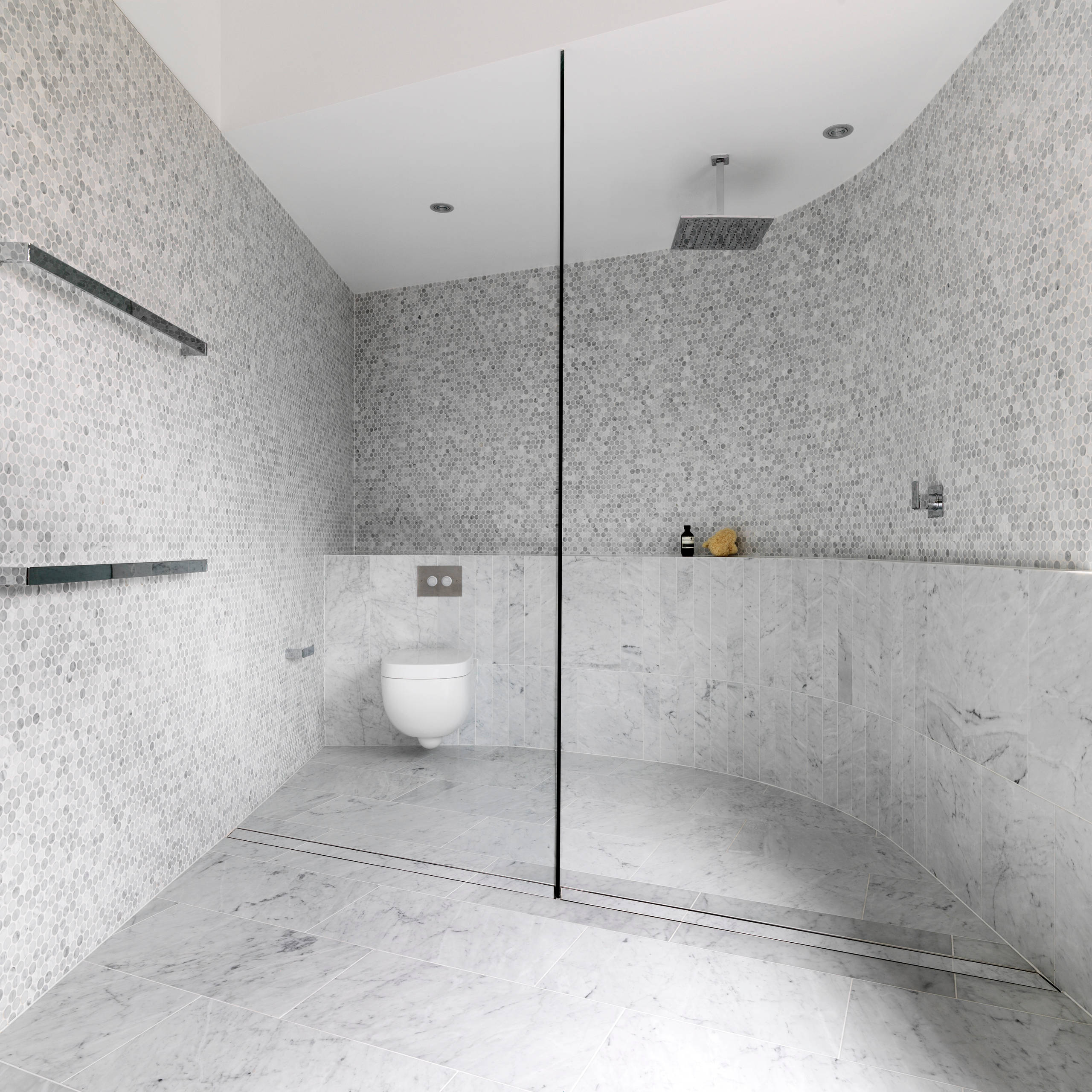 This bathroom has been designed to maximise the view (not the toilet!). A sense of calm and contentment is created as you soak in the bath, with shelves and seat conveniently close by for magazines and maybe a bottle of bubbly! The low wall, while seemingly insignificant, underpins this illusion and ensures that at no point in your bathing experience do you notice the toilet.