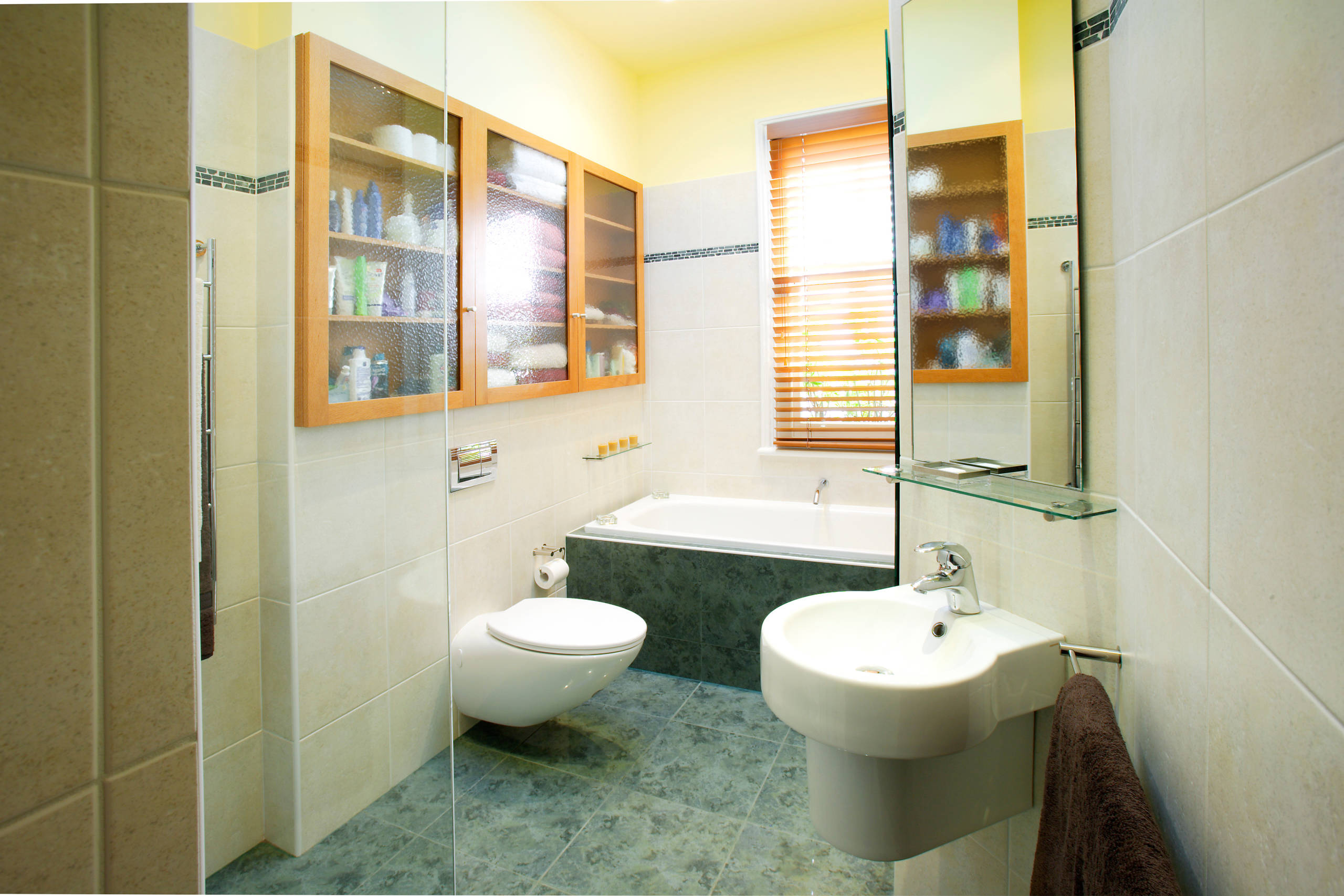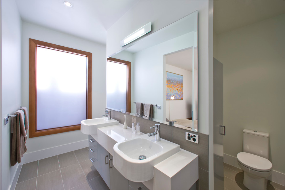 Depending on your entry point to this two-door bathroom, the toilet can be seen or not seen at all. Within the layout, it is essentially treated as a room within a room. The cabinet that divides the space creates extra storage and is a great alternative to a wall, cleverly giving privacy to the toilet area.