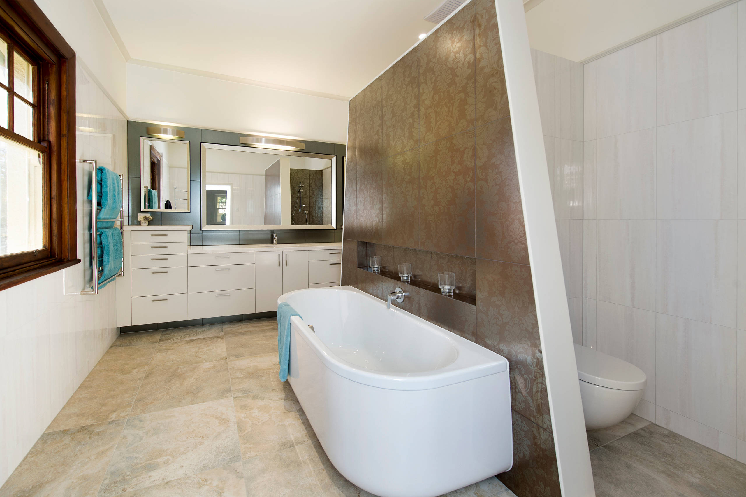 With a tiled angled wall creating a dramatic backdrop within the space, the toilet was never going to be the first thing you notice here. The angled wall is not only a shield for the toilet and shower at the other end, but also creates the feeling of more space. A stepped vanity (one that has different levels) and beautiful freestanding back-to-wall bath keep your attention as you continue your journey through the bathroom.