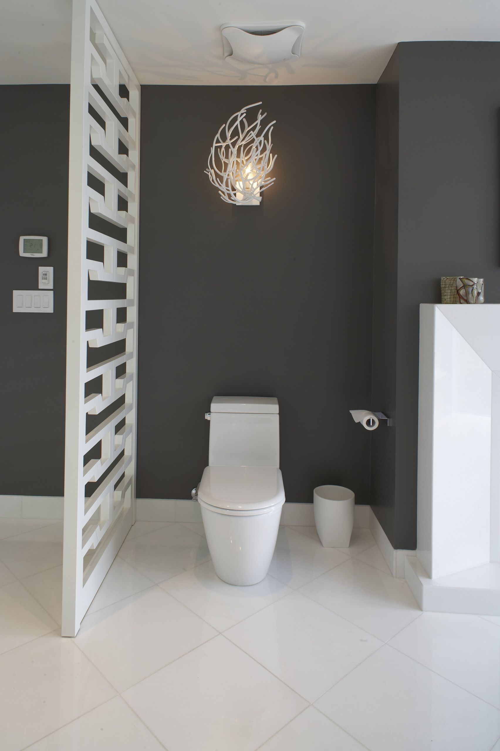 Sometimes, the toilet must be on view. When this happens, embrace it! Again, decorative items like screens and lights work wonders to distract attention from these details. The white floor and accessories also mean that the toilet does not stand out but rather forms a ‘part’ in the overall composition of the room.