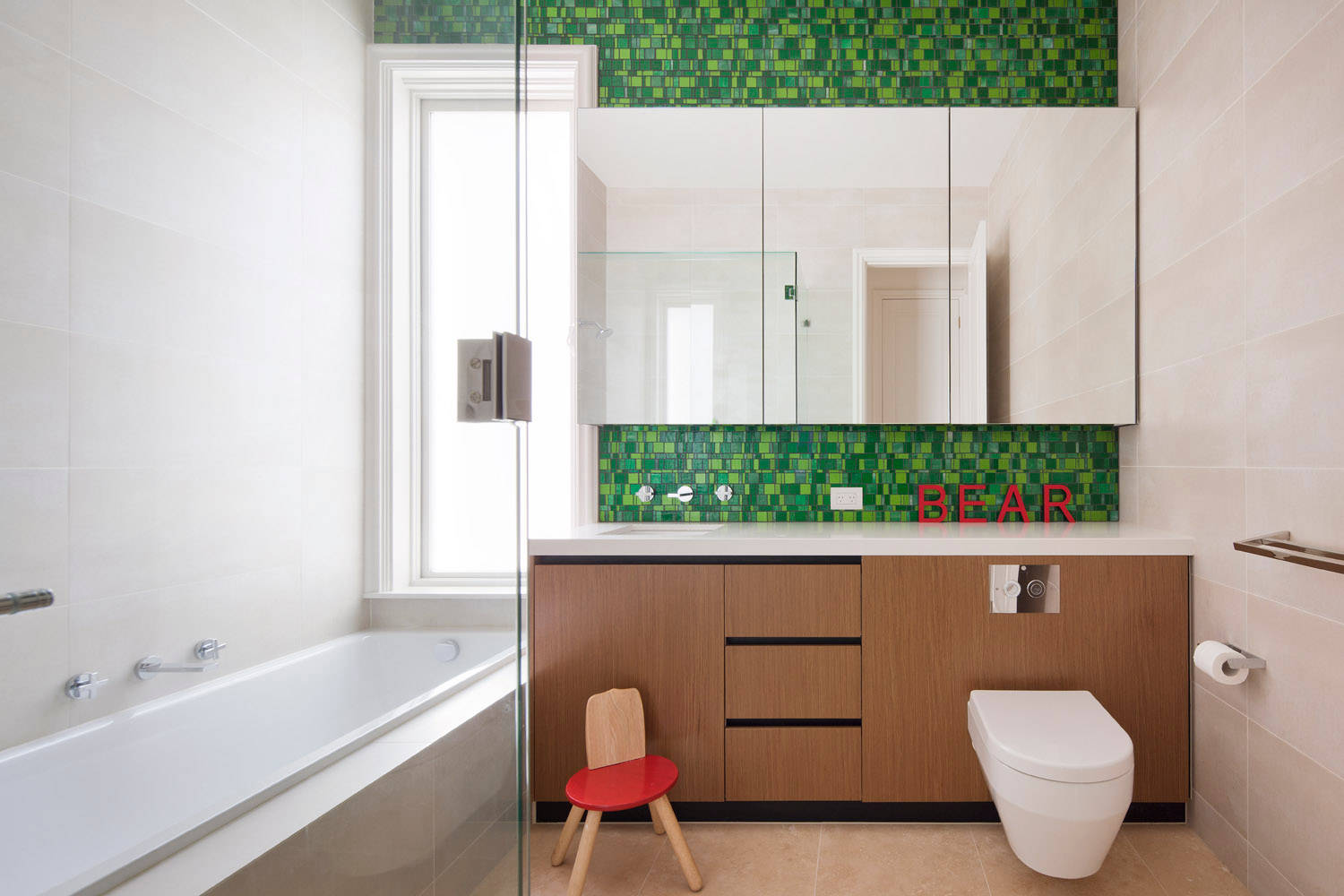 Generally, a built-in bath will not be centre stage of a bathroom. In its place, the vanity can be highlighted. This bathroom has made the wall-hung toilet part of the vanity, with the striking green feature tile drawing the eye to its harmonious pairing of timber.
