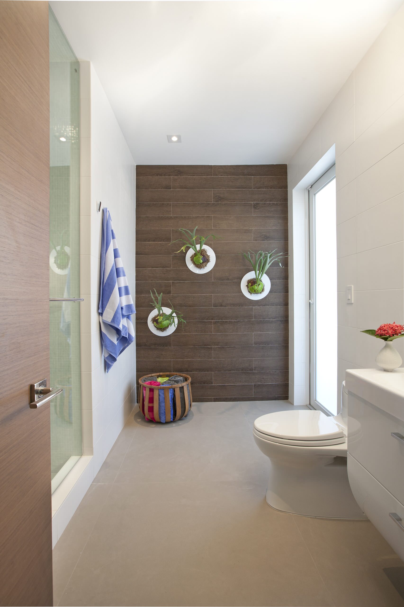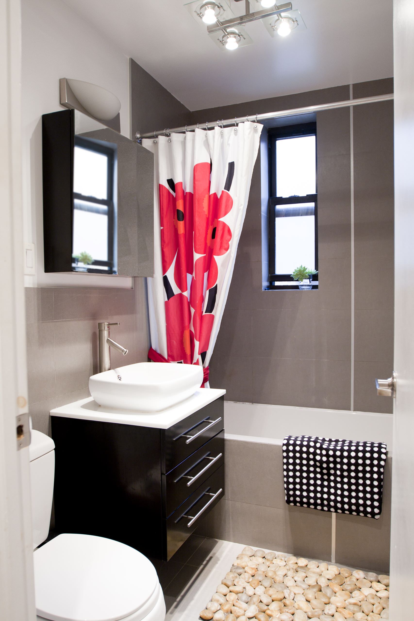 Finished in neutral colours, this modern bathroom gets a splash of bold colour with a Marimekko shower curtain in their iconic Unikko print. The shower curtain takes the space from muted to memorable.