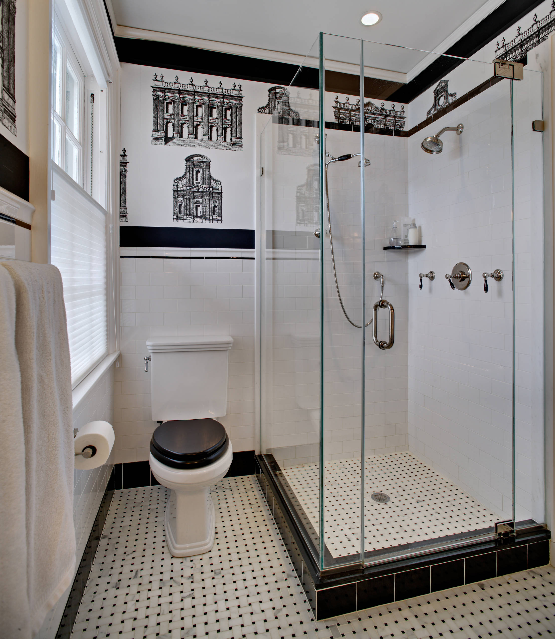 If your bathroom has good ventilation and doesn’t get too humid, you could consider adding wallpaper to jazz up plain walls. This small, simple bathroom is given an elegant update with intricately patterned metallic wallpaper, resulting in a high-end boutique hotel look.